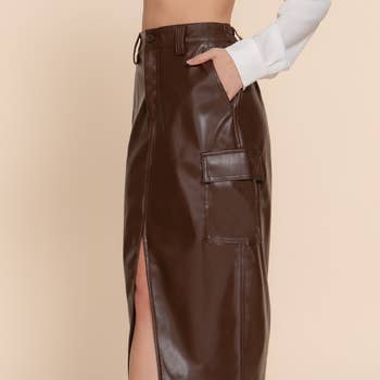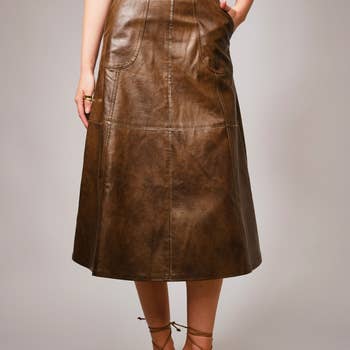 FAUX LEATHER BUTTON FRONT A-LINE MIDI SKIRT 100%POLYURETHANE MODEL HEIGHT: 5’9.5”