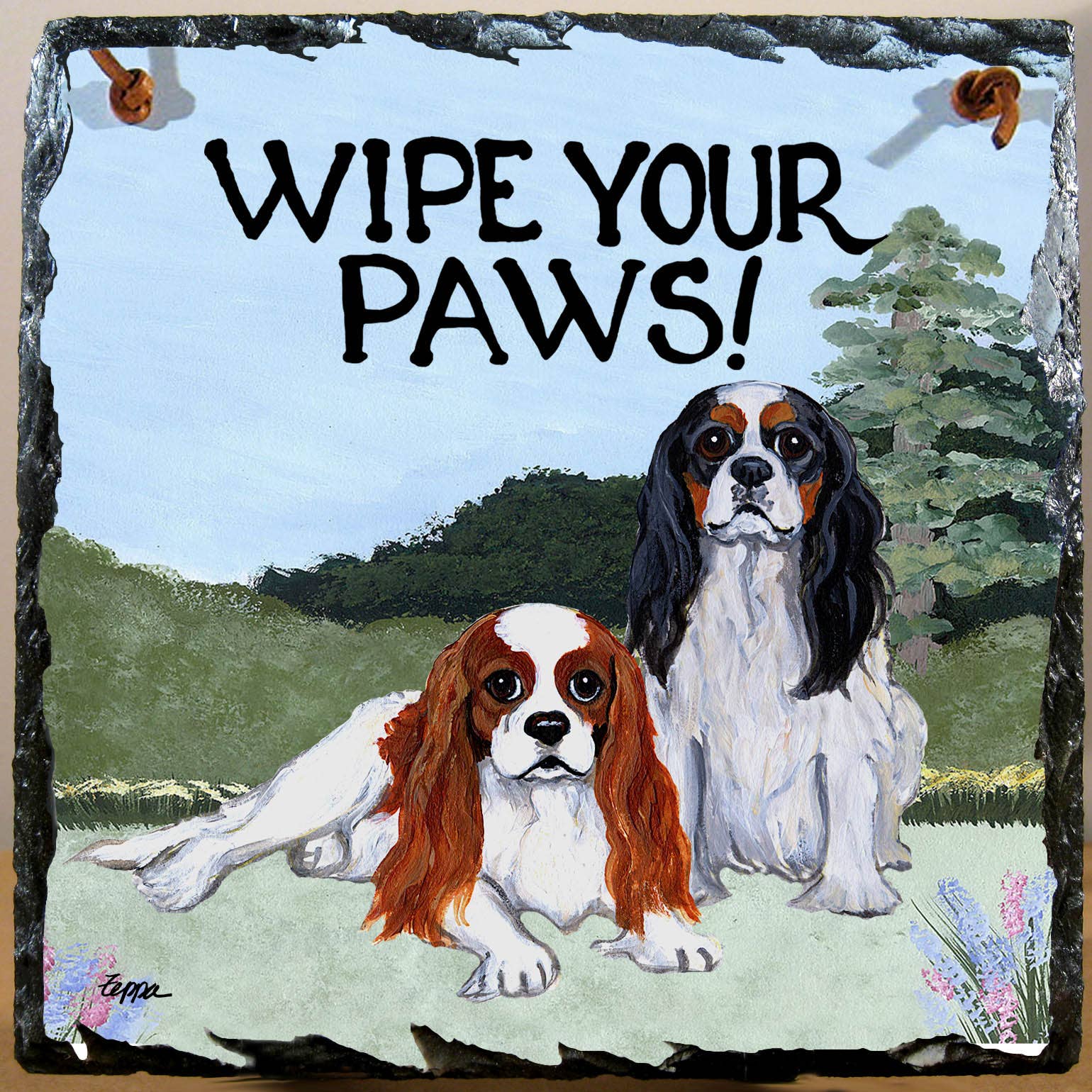 A pawfect greeting at your entry, in the kitchen or in your mud room! A hand hewn slate tiles measure about 7.5 x 7.5 inches and are a about 5/8 inches thick. They are drilled and fitted with a leather strap for easy hanging. Not for outdoor use.