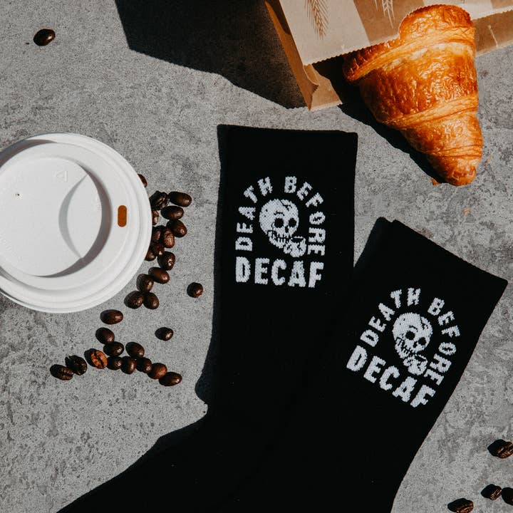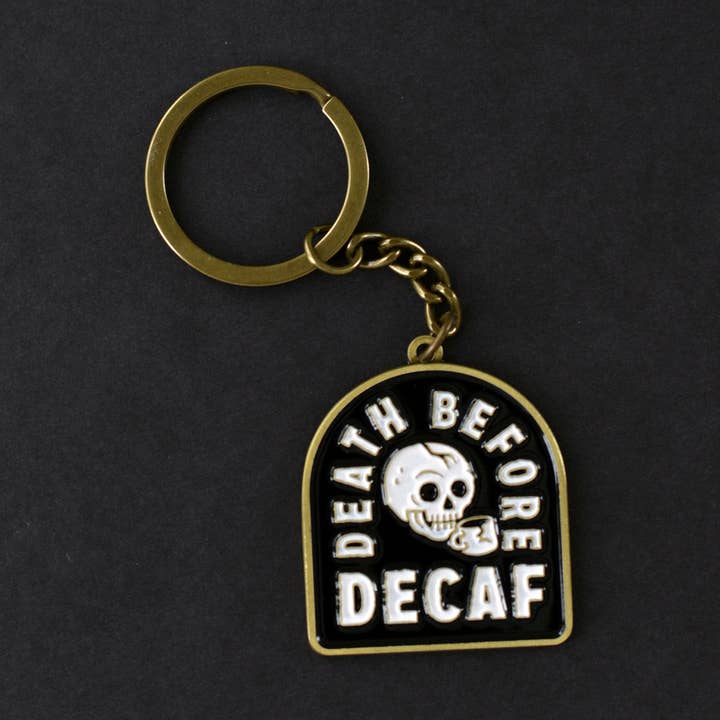 We wouldn't be caught dead drinking decaf coffee. The Death Before Decaf Iron-On Patch features our fun caffeine powered phrase embroidered alongside a coffee mug and skull on a durable, black twill patch. Make a bold statement with this patch stitched on or ironed-on to your favorite denim jacket, hat, or bag. Perfect flair for those that are fueled by strong coffee in the morning. Features: Stitched Lettering, Icons, and Trim 2.5" inches wide x 3" inches tall Can be ironed on or