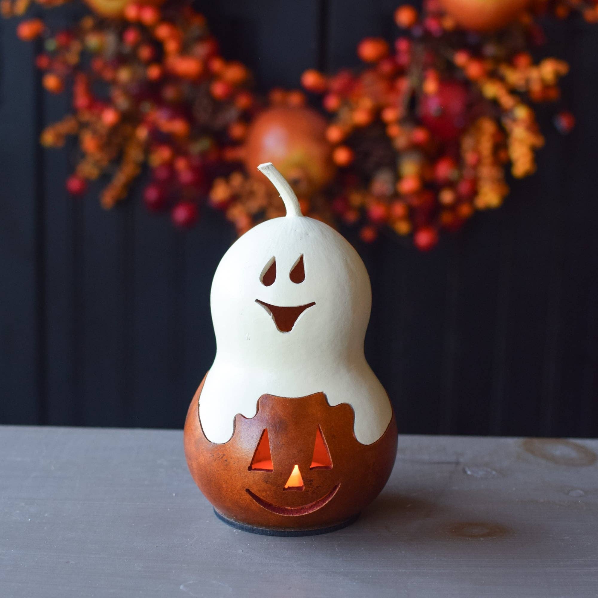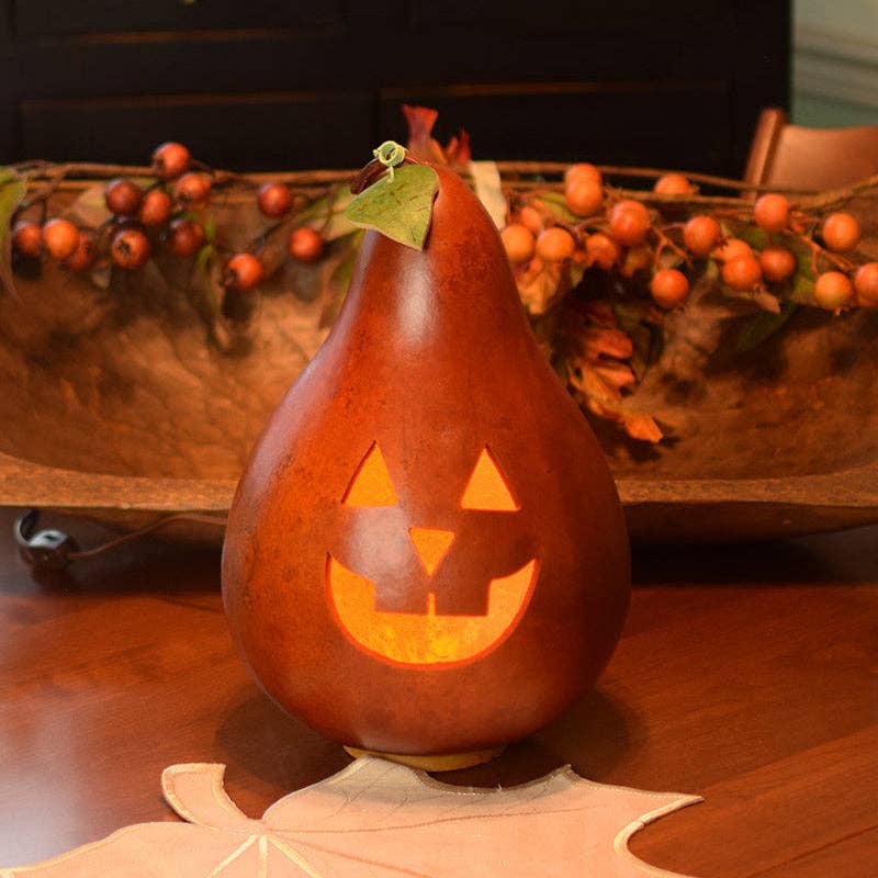 This popular classic design features a burnt orange jack-o-lantern with a white ghost top. Comes with an electric light. Approximately 7" in diameter and 10" tall. Because this design is crafted using a natural gourd, each piece is ever so slightly different to make for a unique artisan piece with natural variance in color and size. Warning: Gourds are flammable. Do not use candles in them or place near open flames.