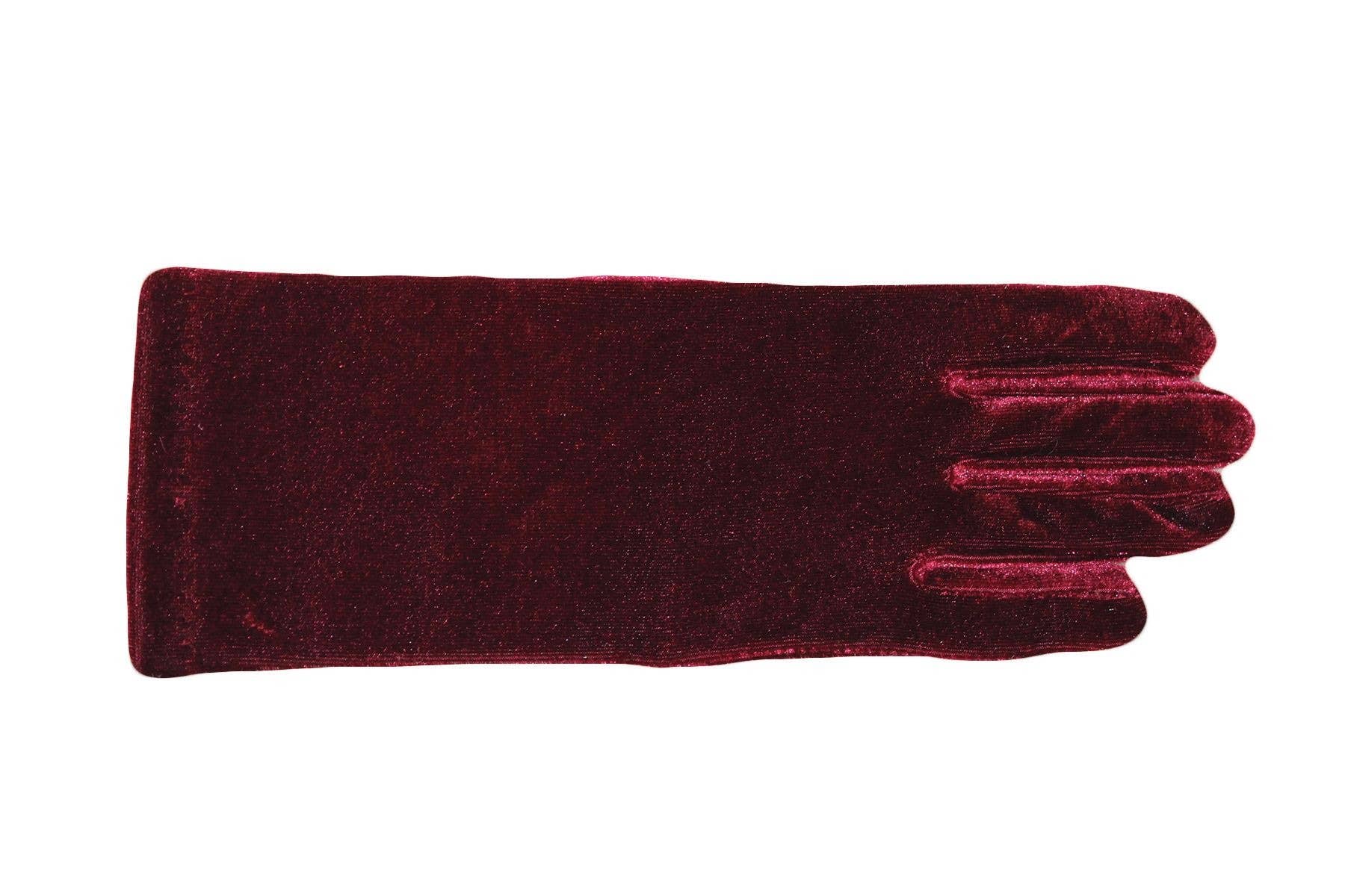 Stretch solid velvet fingerless gloves, featuring a thumb hole. Poly + Spandex, measuring 10" long. Handmade in Portland, Oregon