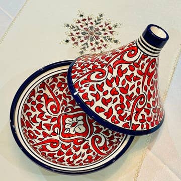 Tagines serve as both the cooking vessel and serving dish, allowing food to carmelize while cooking to stay warm for longer when serving. Each of our tagines is handmade out of terracotta and finished with lead-free glaze, and include recipes and care instructions. Moroccan tradition is to gather around and eat communally from the tagine. The effect of removing the lid of a tagine is simply grandiose. *Lead Free Whole Tagine dimensions: 9" tall / 11" diameter Base only dimensions: 11'' diameter x 2'' depth