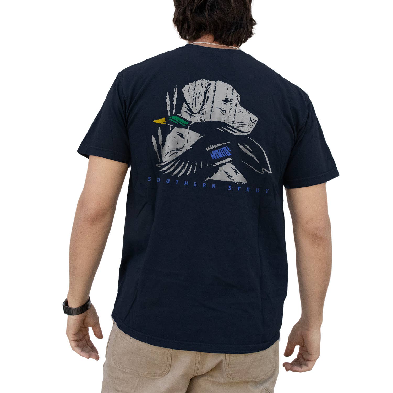 Show your love for hunting with the Southern Strut Lab Sketch T-Shirt. Featuring an artistic sketch of a Labrador with a duck, this soft, lightweight tee offers comfort and outdoor charm. Perfect for hunters and dog lovers alike, it's a standout addition to any wardrobe. This tee comes in the color Soothing Blue.