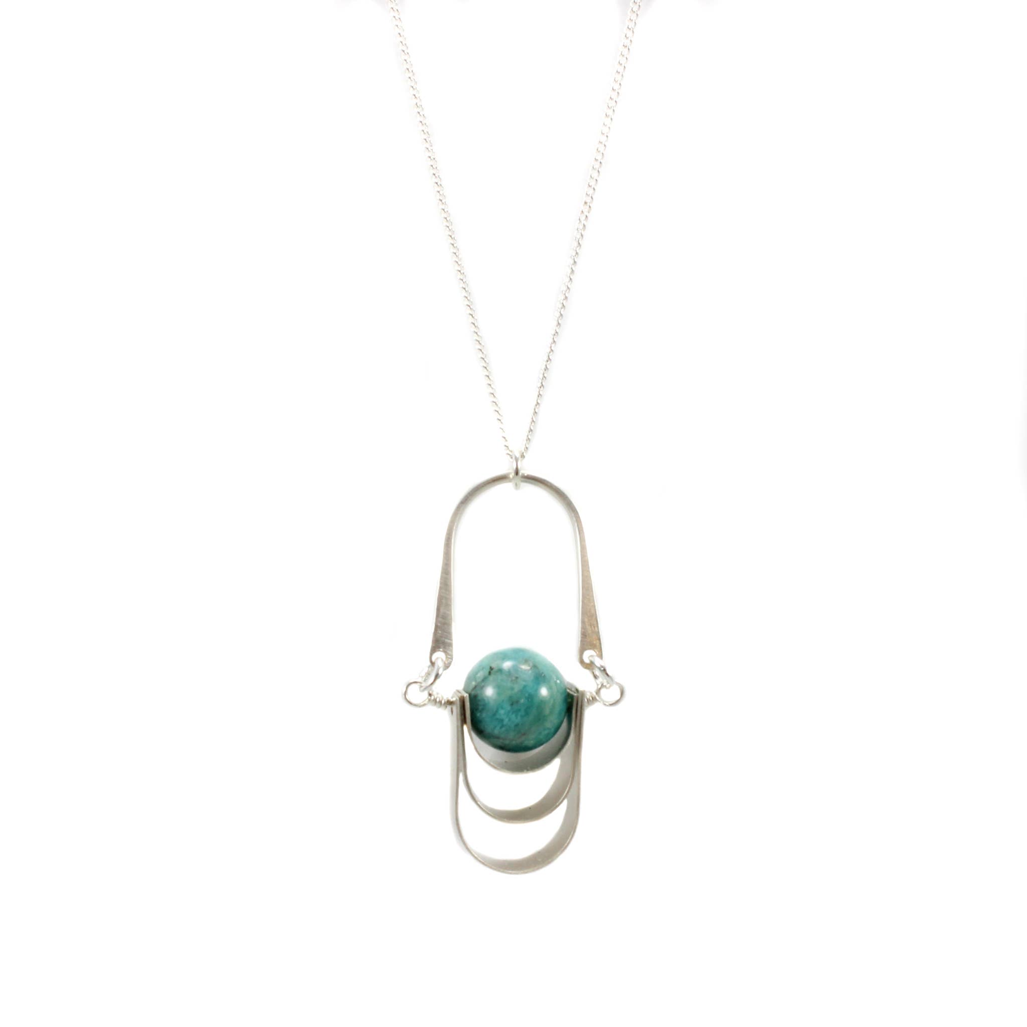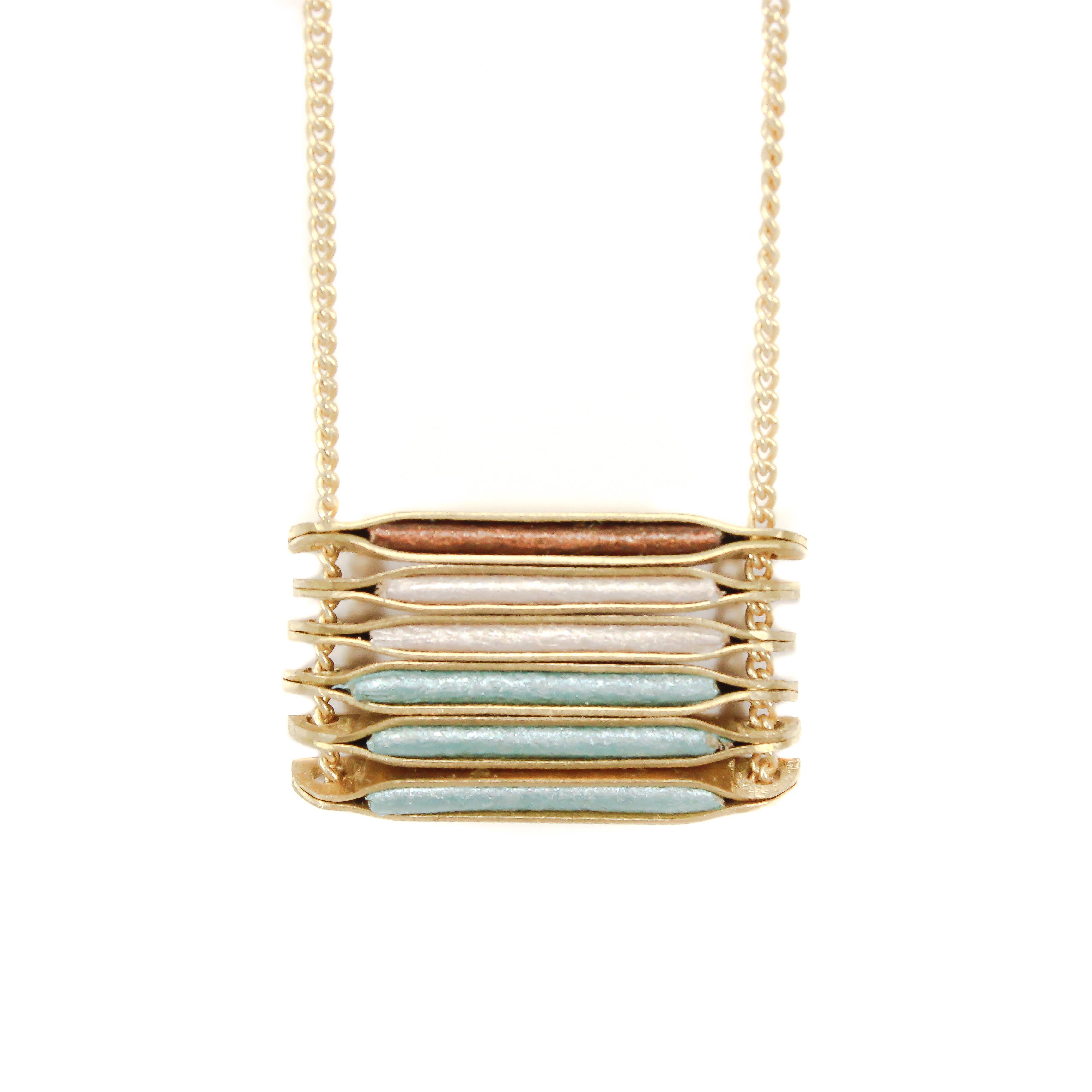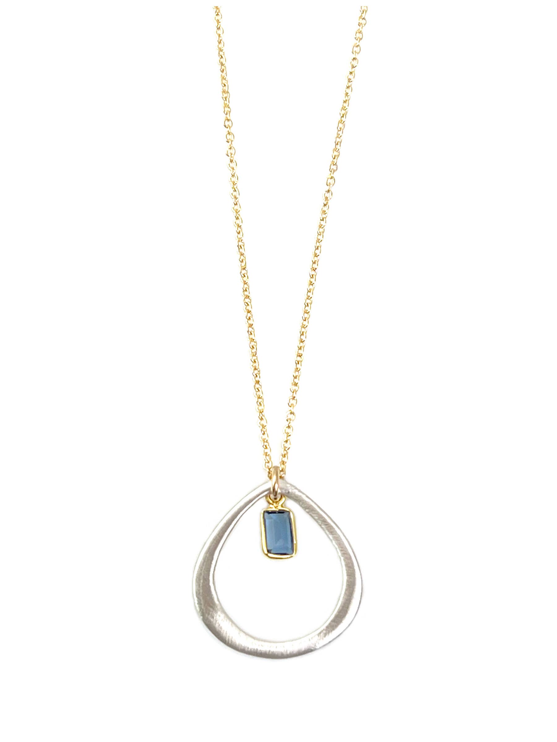 Pendant necklace made of hand fabricated metal showcasing one small stone in the center. Wrapped in complimenting color leather. The smaller of the two sizes. Plated metal curb chain (Sterling Silver Plate, 18k Gold Plate) Metal Color Options: Brass/Gold Plate Silver/Silver Plate 8 Stone Color Options 1" Long // 1/2" Wide 16" Long with 2" Extender Line Code: TBK N8