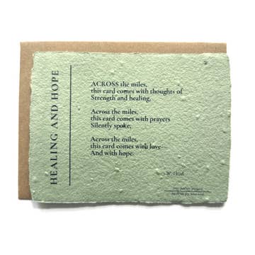 A card for those going through difficult times whether it be chronic illness, depression, rehabilitation, recovery, making a new start, or the long days following the loss of a loved one. A starting point to share love, camaraderie and a steady source of comfort. A2 (4 1/4 x (5 1/2) blank card printed on 100 lb. paper with 30% recycled desert storm envelope and packaged in plant-based biodegradable cello sleeve to reduce plastic waste.
