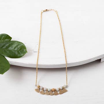 Hand designed with clear glaze, followed by a hand painted overlay of a kiln-fired 22k gold luster. The difference in glazed and unglazed surfaces creates a texture. The chain is 14k gold-filled. Rectangle pendant measures 3/8" wide and 1 1/2" long. Remnant Studios jewelry is handcrafted one piece at a time in Austin, Texas.