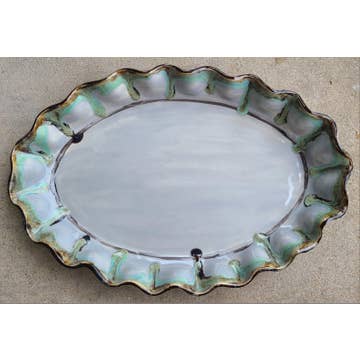 Depict your passion for wine with this Grape Glass Platter from Arthur Court. Detailed leaves accent bundles of grapes on either side of this dish as the handmade, aluminum pieces shine against the glass. Detailed leaves accent bundles of grapes on either side of this dish as the handmade, aluminum pieces shine against the glass. A similar design is crafted in the center of the platter, giving the otherwise smooth glass a varied texture. Size: L: 20.0" / W: 11.5" Care: Wash by hand with mild dish soap and dry immediately - do not put in dishwasher.
