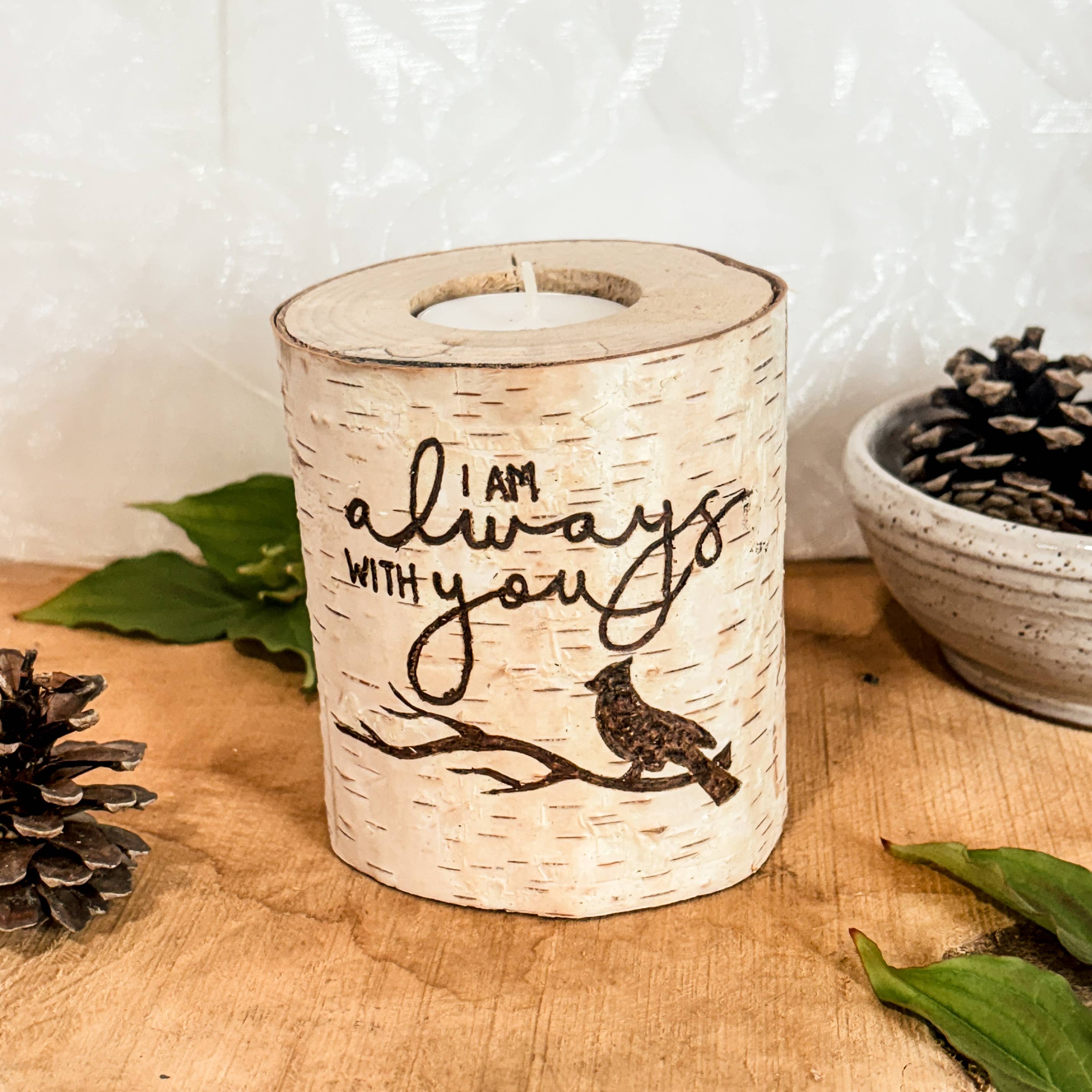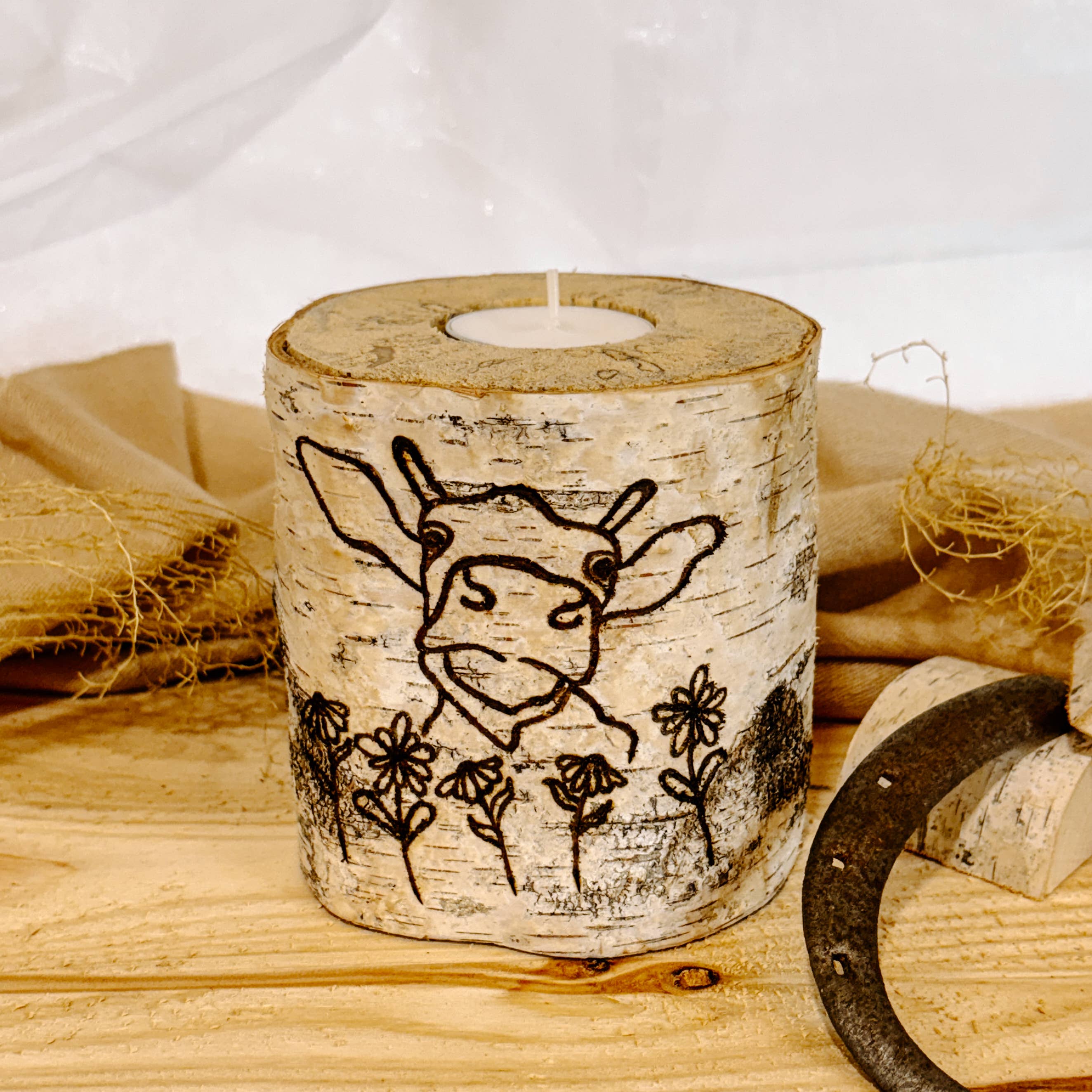 Handcrafted with love by our artisan team in Massachusetts, this charming piece combines the rustic beauty of birch wood with the playful whimsy of a cow and flower design. Sustainably sourced from trailside clearings, each piece is carefully crafted and burned by hand with rustic designs, making every candle holder one of a kind. Perfect for cabin, minimalist, and nature-inspired aesthetics, these holders fit standard tea lights (unscented and replaceable). Proudly handmade in Massachusetts. DESIGN: Perfect for farmhouse-style decor and cozy country homes. Imperfections such as chips, scars, cracks, and some peeling bark add to the natural beauty of the product and help to make each candle special and unique. SPECS: Measures approx. 4" tall & 2.5-4" in diameter and is drilled to hold a standard tea light candle (included).