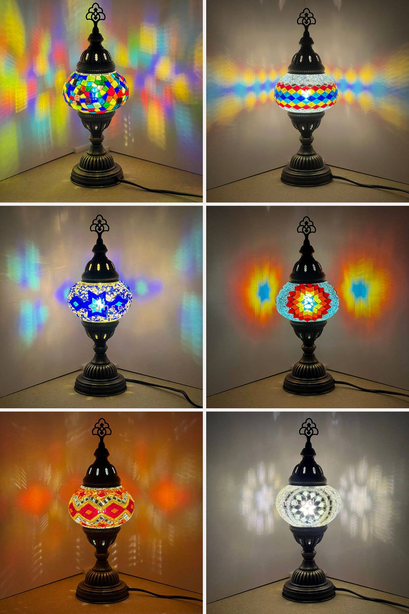Bring warmth, tradition, and a touch of magic into your home with our handcrafted Turkish mosaic moon lamp. Each lamp is carefully made by artisans using hundreds of hand-cut glass pieces and beads, arranged into timeless geometric patterns that glow beautifully when lit. ✨ Key Features: Min Order: 12 Pcs - Ships One Of Each Colors Handmade & Authentic – Each lamp is individually crafted in Turkey, making every piece one-of-a-kind. Vibrant Colors & Patterns – Creates stunning reflections on your walls and ceiling, transforming any room into a cozy, enchanting space. Moon-Shaped Iron Stand – Antique bronze finish with intricate detailing that complements the colorful glass globe. Perfect Size – Ideal for nightstands, desks, living rooms, or as an accent piece for boutiques, cafés, or meditation spaces. Versatile Gift – A thoughtful present for housewarmings, weddings, Ramadan, Christmas, or anyone who loves art and culture. 📏 Approximate Dimensions: Globe Diameter: 6 inches Height with Stand: 19 inches 💡 Details: E12 socket, compatible with LED bulbs (not included). Easy plug-in with on/off switch. Safe packaging for wholesale orders. Transform your space with the warm glow of tradition—a lamp that’s not just lighting, but art.