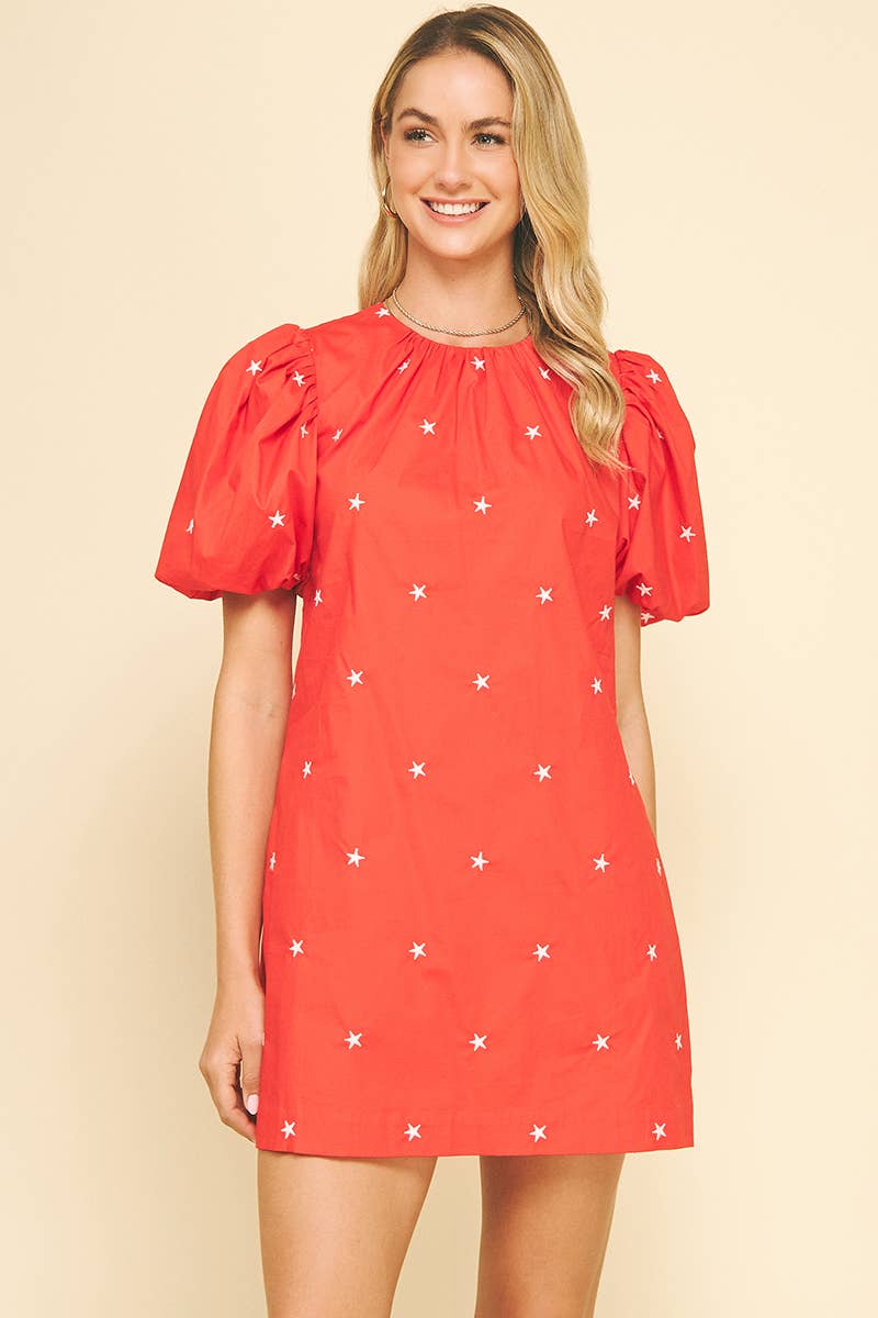 V-neck With Short Bubble Sleeve Bottom Leopard Star Patch Solid Dress 100% COTTON