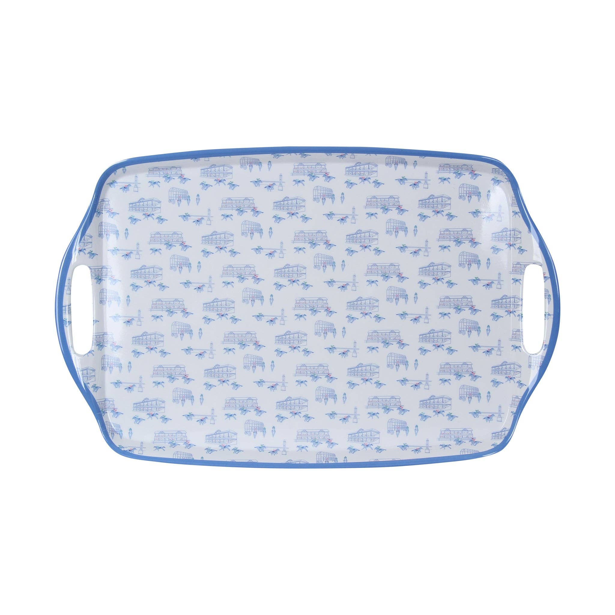 This 16.75” long x 11” wide x 1” deep serving tray is constructed from sturdy glassware. Each of the sides has a handle-like curvature, making it easier to hold this tray after it's filled with charcuterie essentials. . The red boarder surrounds the edges of the blue background. The darker blue waves accompany the two large red crabs with blue pinchers. Dishwasher safe. Handwashing is recommended to preserve decals. Packaged in a printed-patterned box that cheerfully displays the pattern on the duble kitchenware. Wonderful for a waterfront, seaside boat, or ocean beach-themed kitchen. This summertime feel will bring a bright pop of color to the home. Lake, Beach, or Boat lovers will be thrilled to add this unique piece to their collection.