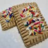 Peanut butter cake ball with peanut butter chips inside that has been dipped in peanut butter and drizzled with sprinkles. Sprinkles color subject to change per season/holidays. Treat case of 12 - All Natural & Preservative Free - Healthy & simple ingredients - The shelf life of this Blue Cerebus cookie is 1 month, treats can be frozen to extend shelf life. - Ships via UPS Ground or UPS 3 day/USPS (if time in transit/temperatures dictate) - Ingredients list available upon request