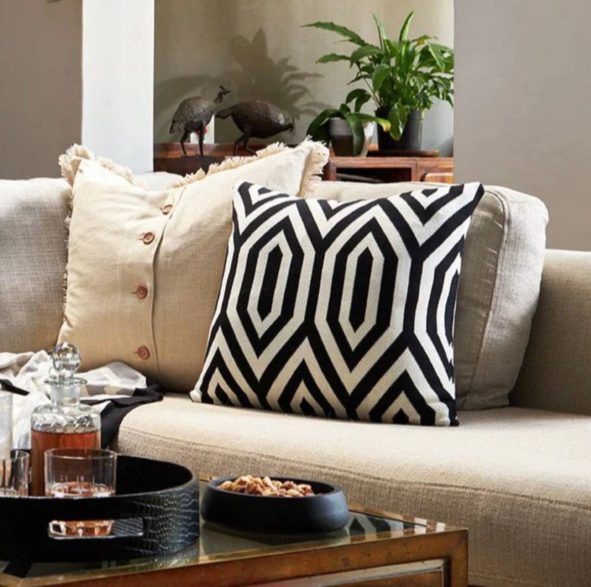 Make a bold statement with the monochrome Fantasy pure-cotton knitted scatter cushion, in a strong geometric design. Not just ultra stylish, the Fantasy scatter is also uber comfortable thanks to its plush feather-and-down inner. Our feathers and down are ethically sourced as a by-product of the poultry industry. We do not – and will never – use filling sourced from live plucking. Care Instructions Remove feather inner from scatter cover before washing. Scatter cover – machine wash at 40ºc, do not bleach, iron at max temp 110°c, Do not tumble dry. Feather inner – machine wash on delicate cycle. Specs and Dimensions * 100% cotton knit * L: 18" x W: 18" * Monochrome * Pillow inserts are included * Includes ethically sourced feather-and-down inner