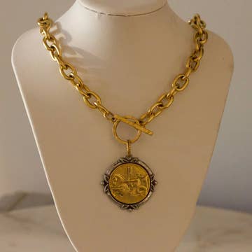 The Neptune Coin Necklace is a striking medallion-style piece that blends timeless mythology with modern jewelry design. Crafted from pewter with a 12k antiqued gold finish, the pendant depicts the god of the sea in bold relief. Suspended on a 16-inch chain with toggle clasp (total 17 inches), it makes the perfect statement necklace for layering or wearing solo. Details * Pendant: Large coin medallion featuring Neptune * Finish: 12k antiqued gold over pewter * Chain Length: 16 in + 1 in toggle (total 17 in) * Closure: Toggle clasp * Material: Pewter
