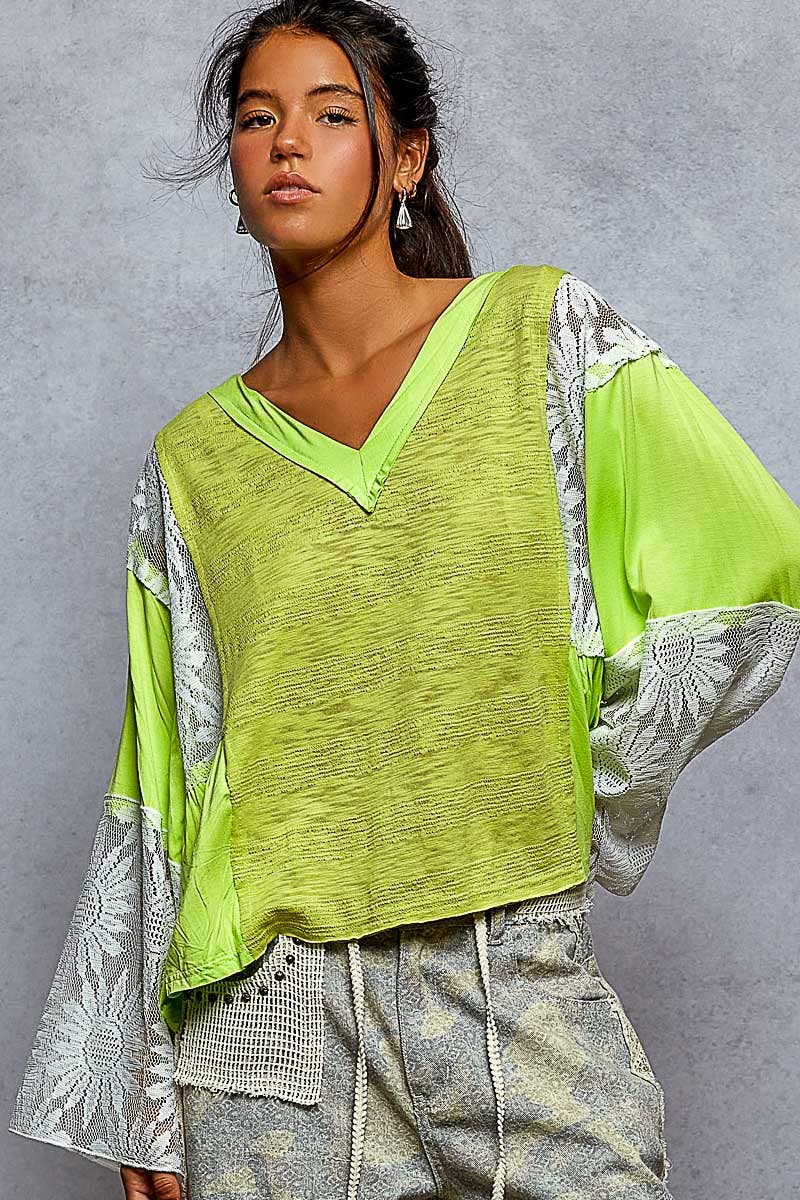 V-neck long flare sleeve lace detail solid top SALE