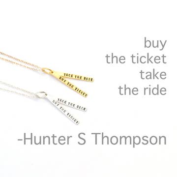 Wanderlust quote necklace, handcrafted by Chocolate and Steel. "Buy the ticket, take the ride" -Hunter S Thompson. Counterculture icon Hunter S. Thompson was an American journalist best known for writing 1971's 'Fear and Loathing in Las Vegas' and creating "Gonzo Journalism." This quote is perfect for Hunter S Thompson fans, travelers young and old, graduates, or really anyone who loves life. The quote is meant as a personal reminder to live life to the fullest - you only have one life to live. Available in recycled sterling silver or 14kt gold vermeil. Measurements: 2 Bar Necklace, each Pendant measures approx 1" x 1/8" What You’ll Love * Bold & Unconventional – This Hunter S. Thompson jewelry piece embodies the rebellious spirit of a literary icon. * Handcrafted with Meaning – A handcrafted silver jewelry piece for those who appreciate artistry and edge. * A Statement Piece – A unique pendant necklace that stands out as a conversation starter. * The Perfect Gift – A gift for book lovers and free thinkers, great for him or her who admires fearless storytelling.