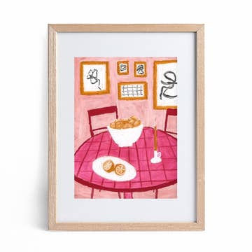An original cat and cocktail illustration adds a splash of fun to home decor with an orange tabby cat curled up in a coupe cocktail glass. Drawn in a retro 60s style, this cat illustration is drawn on a pink background with red and orange details and touches of blue. It makes a great product for cat lovers. This print is one of a series of illustrations of cats in cocktail glasses drawn in a mid-century style. About this product: * High quality archival art print on premium cotton rag paper, printed in Michigan. * Preserves the textures and colors of the original illustration. * 8x10 and 10x10 prints include ½” border on all sides, 11x14 prints and larger include 1” inch border on all sides * All prints delivered in packaging: plastic sleeve with cardboard insert Frames not included in purchase. Original artwork by Shayna Sell. Copyright © Art & Design by Shayna Sell. Copyright non-transferable with sale.