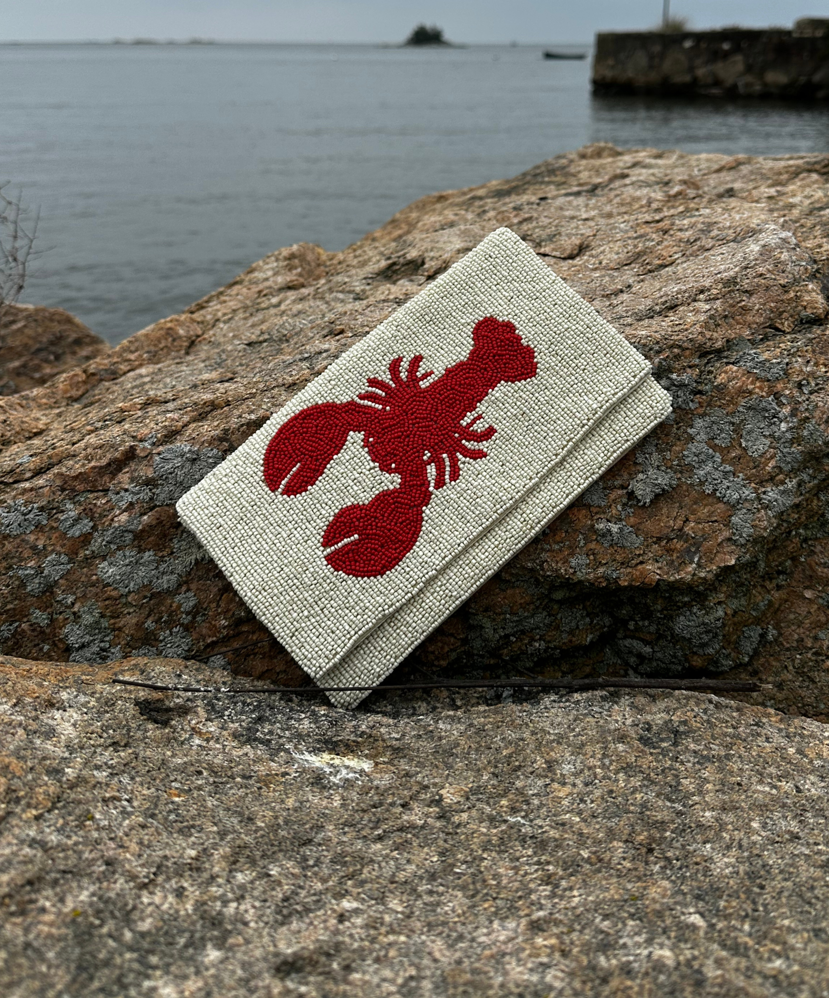 Elevate your coastal-chic style with our Falmouth beaded purse. Crafted from navy beads and featuring a stylish bamboo handle, this purse is perfect for those who love a preppy, water-inspired style. Shown here with the red lobster design. -Zipper Closure -Bamboo Handles -Beads on front / canvas back