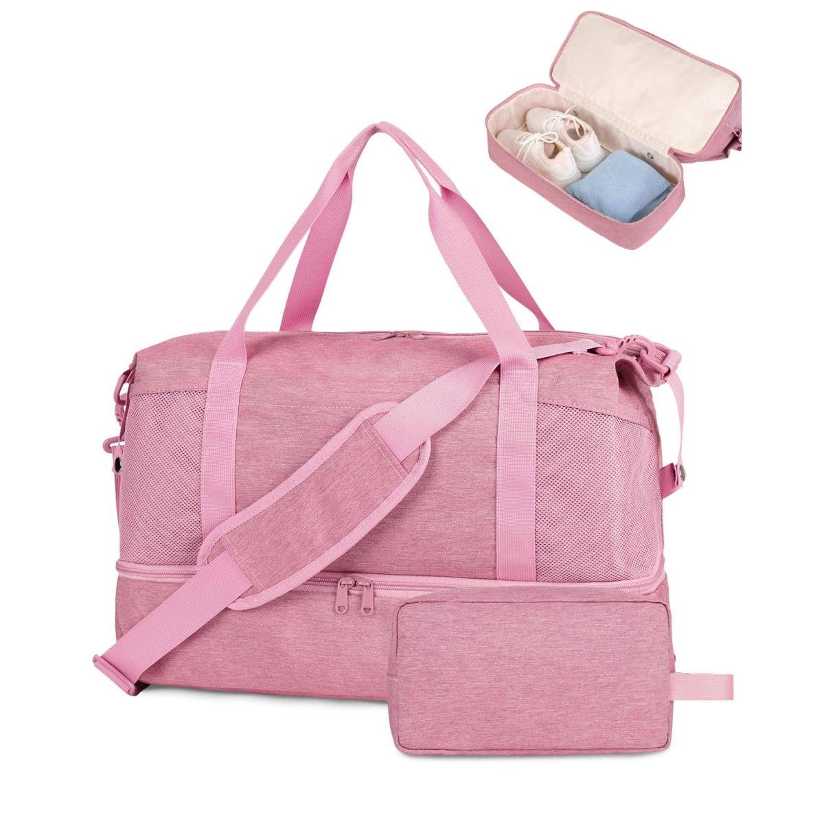What You Get: One Duffel Bag One Laundry Bag One Toiletry Bag Size: Duffle Bag: 18 x 14 x 8 inches Features: Inner waterproof PVC compartment for your toiletries, wet clothes, swimsuits, towels, etc. Features an external USB port for on-the-go device charging, enhancing journey convenience. Ventilated shoe compartment accommodates various sizes of slippers, athletic, high heels, and more. Roomy for daily essentials on 3-5 day trips. Trolley Sleeve with Zipper Pocket Interior Pockets Adjustable and Detachable Shoulder Strap Front Pocket with Magnetic Closure