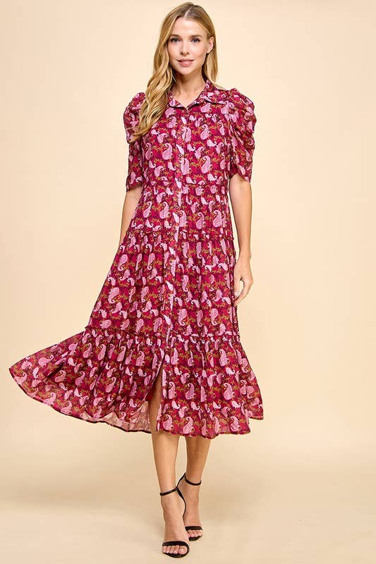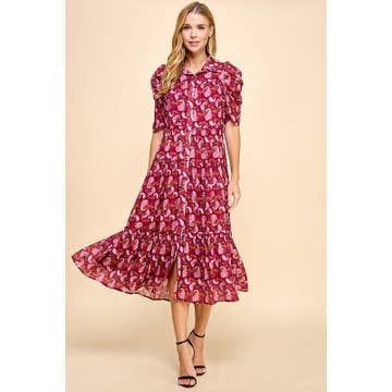 - This autumn-inspired mini dress features a rich floral print in warm shades of rust, crimson, and fuchsia. - Designed with a flattering A-line silhouette - Long puff sleeves with elastic cuffs, a delicate ruffled neckline, and button-front detailing for a feminine touch. - The removable self-tie belt cinches the waist, creating a defined shape while offering versatile styling. - Finished with a tiered skirt for added movement, this dress pairs effortlessly with ankle boots for a chic fall look. - Fall Dress / Fall Print Dress - Pocket STYLE# - LWD3273 * HPS - 34" SELF - 100% COTTON
