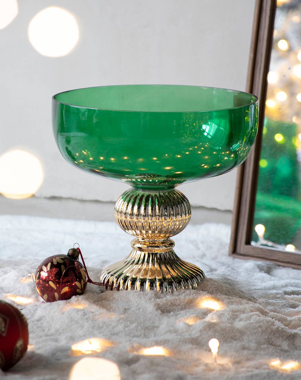 Introducing the Emerald Fluted Elegance Glass Vase, a stunning piece that blends timeless luxury with classical sophistication. Crafted from vibrant green glass, this vase features a rich, emerald hue that captures the depth of a precious gemstone, its glossy finish reflecting light with a mesmerizing shimmer. The vase’s elegant, goblet-like silhouette is adorned with delicate, vertical fluting, creating a textured surface that enhances its visual depth and evokes the grandeur of vintage glassware. The wide, bowl-like top gracefully narrows into a slender stem, supported by a sleek, silver-toned metal pedestal with intricate, fluted detailing, adding a touch of opulent contrast. Perfect for displaying lush blooms, decorative branches, or as a standalone accent, the Emerald Fluted Elegance Glass Vase brings a bold yet refined aesthetic to a contemporary living room, chic dining area, or elegant office, making it an exquisite piece for those who appreciate the fusion of vibrant color.