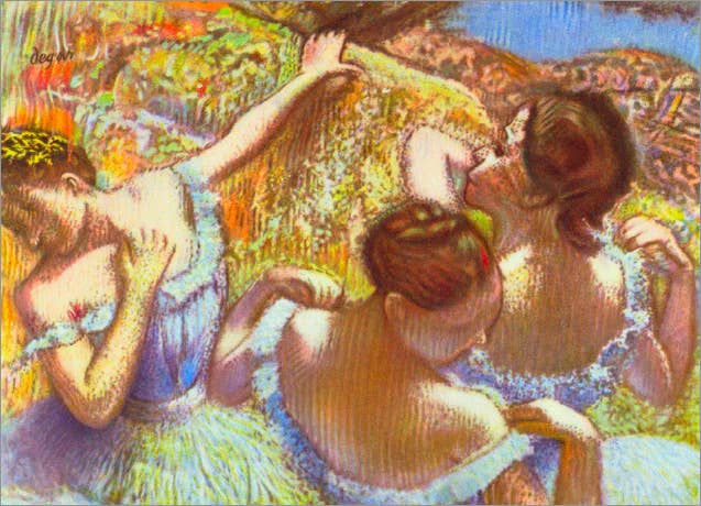 This painting, "Two Dancers," captures an intimate moment between two ballet dancers, bathed in the warm glow of stage lights. The dancers, adorned in pink tutus, exhibit a graceful elegance, their poses reflecting both rest and readiness. The backdrop of soft browns and greens contrasts beautifully with the dancers' costumes, while the deep blues add a touch of depth to the scene. Degas' masterful use of pastels brings out the delicate textures and subtle interplay of light and shadow