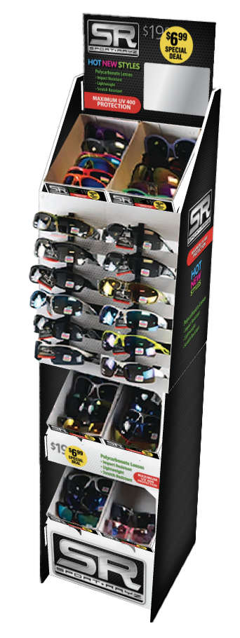 Camouflage Cardboard Display Showcase the rugged appeal of camo sunglasses with our preloaded camouflage cardboard display. Featuring 144 pairs of assorted sunglasses, this display offers a versatile range of styles to suit every customer’s preference. From wrap-around and wayfarer designs to classic, small, medium, and large frames, there’s a style for everyone. Choose from color-mirrored or solid lenses for added variety and appeal. For added convenience, the display is designed with a built-in storage compartment at the bottom, complete with a secure door—perfect for keeping extra inventory close at hand. This functional and eye-catching display is a must-have for retail spaces looking to highlight trendy, outdoor-ready eyewear.