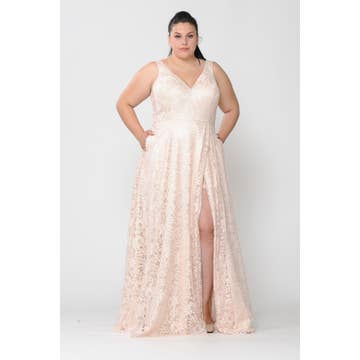 Style# PM22565 -Plus Size Floral Print Surplice Maxi -Fully Lined -Leg Slit on left side of full length skirt -Back Zipper -100% Polyester -Dry Clean Only