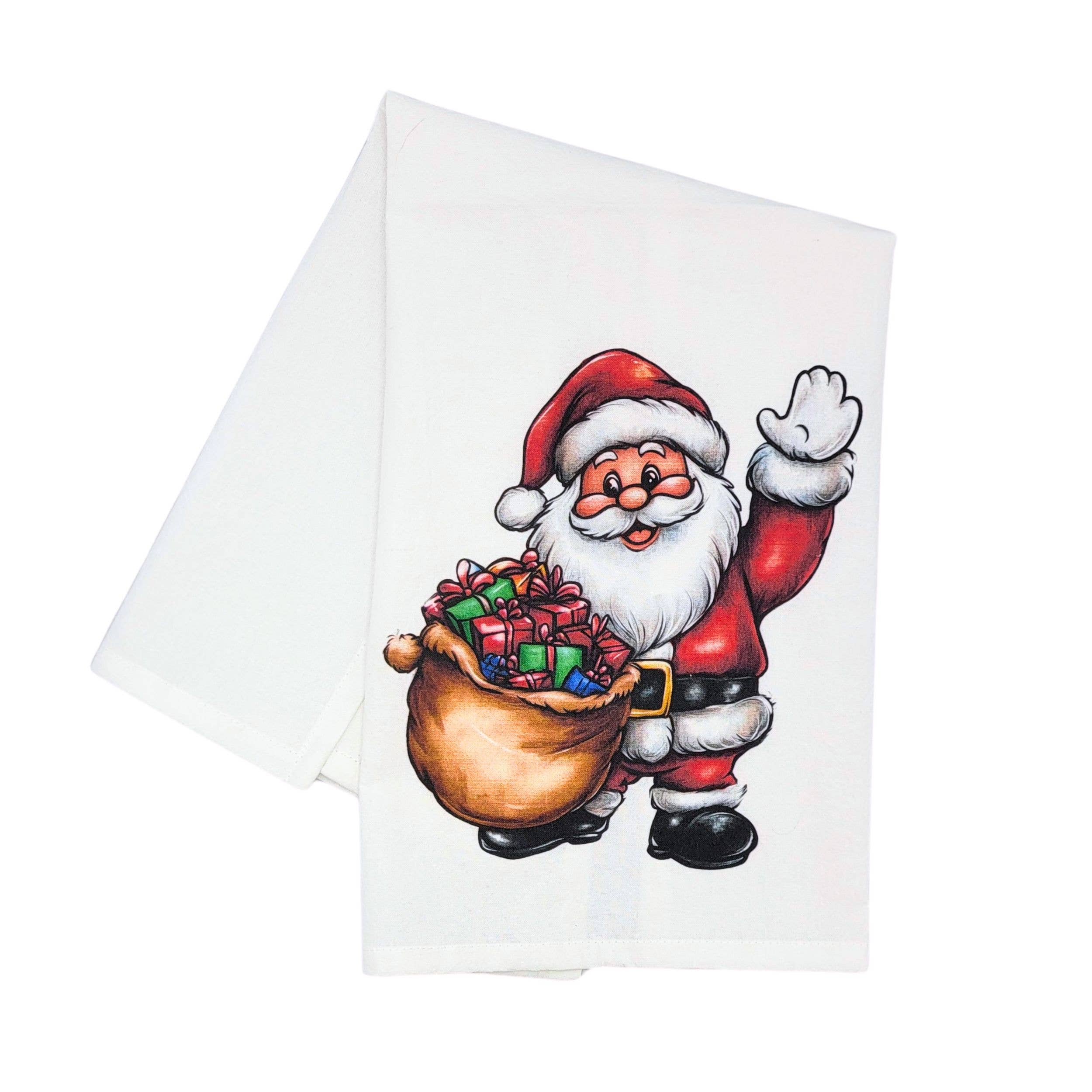 Experience the charm of a southern Christmas with our Santa With Bag Vintage Retro Christmas Tea Towel by Barrel Down South. Perfect for the holiday season, this tea towel adds a touch of nostalgia to your kitchen decor. Crafted with care, it is a reflection of our commitment to creating small batch, southern inspired goods. This is more than just a tea towel, it's a piece of holiday spirit you can enjoy year after year.