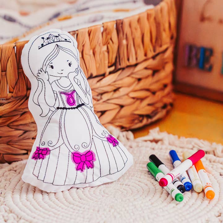 Purple polka dots, Orange stripes, green horns--what would your monster look like? Included washable markers will have them bringing their very own monster to life. Available in singles or boxed gift set. • White cotton outer, polyester inner • Washable markers included • Machine washable, air dry • Reusable coloring activity • Great travel or quiet time activity • Approx size: Furry: 5” x 9” Curly Horns: 5.5” x 8.5” Silly: 6” x 7.5” Round: 7.5” x 6.5” One Eye: 5.5” x 8” Packaging: • Single: Bagged with markers • Set: Gift boxed with a set of markers (White gift box with clear lid and tied with ribbon)
