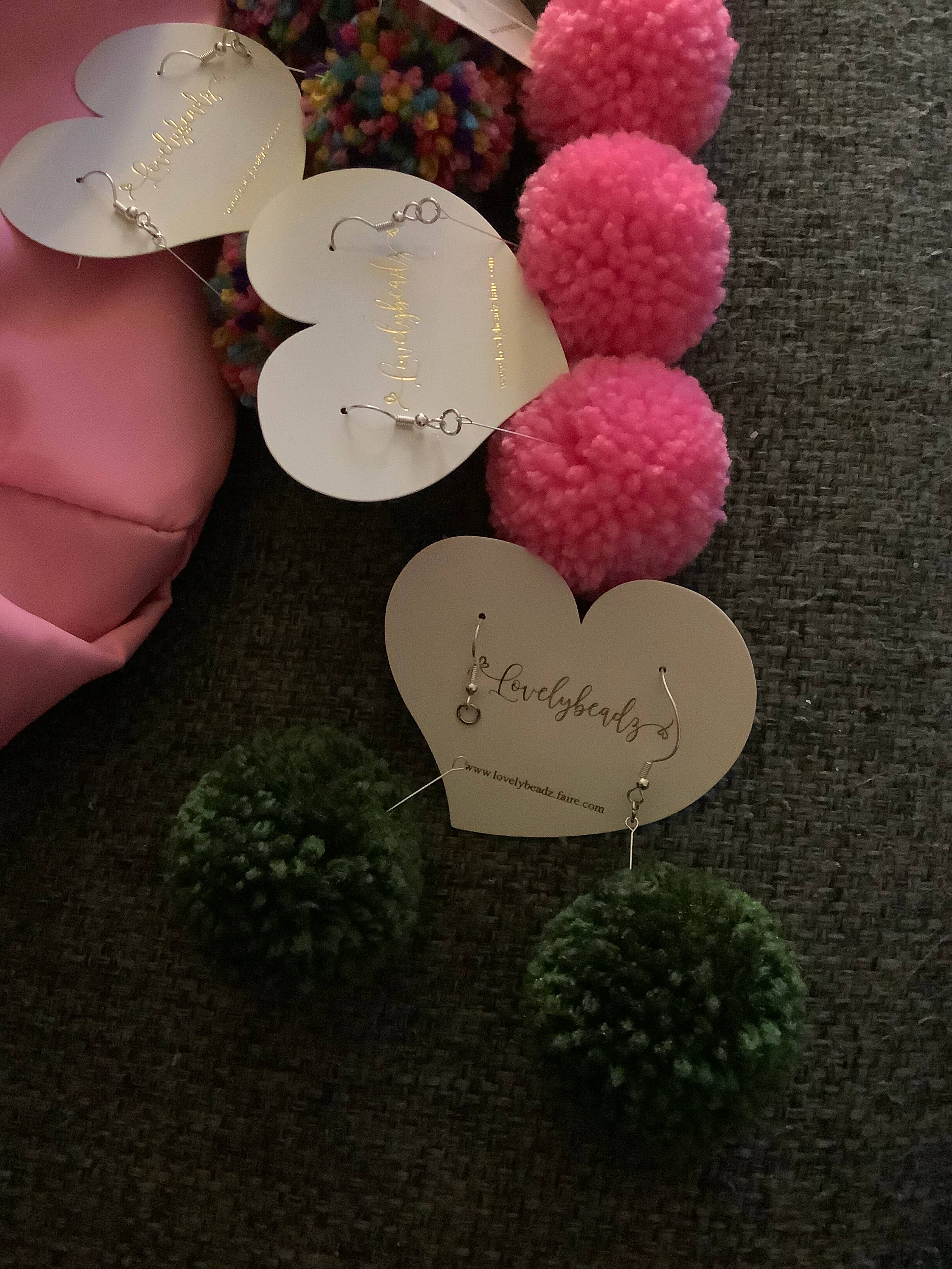 The olive Poms, one Pom came off as soon as we opened the box. I would recommend better packaging. It looked like they were just thrown in a box and sent. No invoice in box either. The poms are very well made, and I do appreciate them being handmade. Thank you.