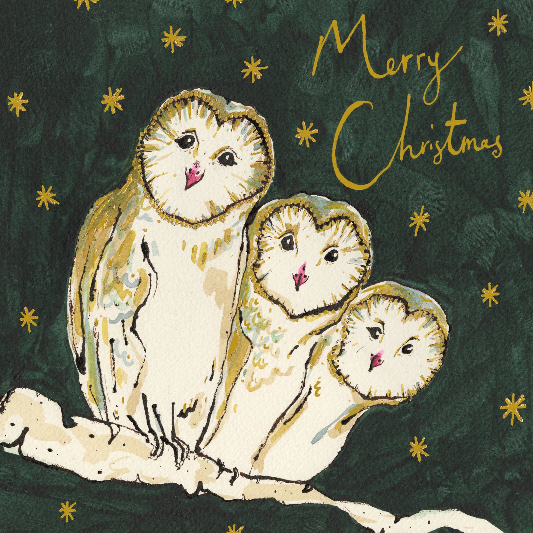A Christmas card illustrated with three friendly penguins wandering through the snow. Left blank inside so that you can write your own message. 15cm x 15cm. Printed on a heavy-weight, soft mat finish, FSC certified card and supplied with a high quality envelope. The card and envelope are supplied 'nested' (no cello or sticky clasp). Designed and printed in the UK.