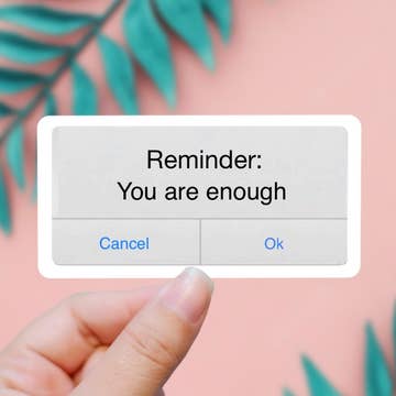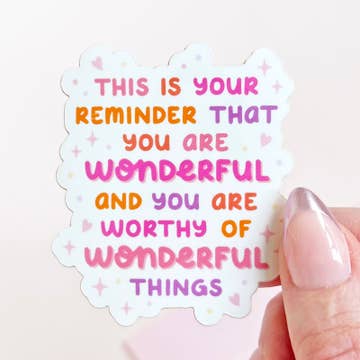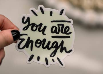 A little reminder with a big message. If you've ever felt self-doubt, or need an encouraging boost, pop this cute sticker anywhere you need a kind reminder that you are enough. WHAT YOU NEED TO KNOW: > 2.4" x 2.5" > Professionally manufactured > Printed on waterproof, glossy vinyl > Lightweight product – makes for low-cost shipping WHY CUSTOMERS BUY: > A positive, self-care quote that speaks to their heart > Cute and whimsical vibes > Highly durable and waterproof (and dishwasher-safe); can be stuck anywhere > Adorable, scalloped border for eye-catching appeal I will happily place an order with my manufacturer should you wish to purchase more units than what is listed in stock. Please reach out to me for manufacturing and turnaround details.