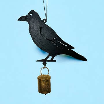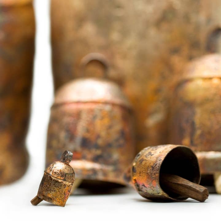 Sparrow chime with three desert bells. Approximately 7" in length. Handmade by Janmamad Luhar and his family in the Kutchchi desert region of western India. Recycled steel is used to form the bells. Each bell is first beaten into shape by hand, dipped in copper, padded with clay, then buried under the hot desert sand in a kiln. This firing anneals the metals into bronze. After firing, the clay is chiseled off. Finally, Janmamad personally hand-tunes each bell in every chime! This age-old technique of metal-work is what gives each piece its unique patina and exceptional tone. These wind chimes can be hung indoors, under a porch or awning, or outdoors in the garden or under a tree. Bronze, being an alloy of steel and copper, these chimes will patina naturally over time. Hand-made in Gujerat, India.