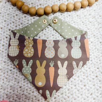 Bring some extra cuteness to your furry friend's Easter outfit with our Bunny Bandana. Made with soft, lavender fabric and featuring an adorable bunny and carrot design, it's the perfect accessory for a festive look. Let your dog hop into the spring spirit with our Bunny Bandana. Made of 100% OEKO-TEX Standard 100 cotton Care: machine wash cold and lay flat to dry Packaged with 100% recycled paper hang tags. Eco-friendly goods for outdoorsy dogs and dog moms, sustainably made in Michigan Style: Bohemian, modern, outdoor, active, retro, vintage