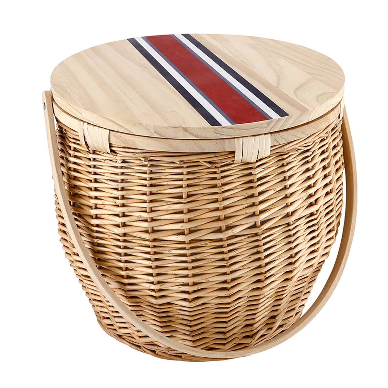Approximate dimension: 12.5" x 7.5" x 7.5". Natural woven woodchip. Cherry faux leather clasp. Take it along to your next picnic or barbecue. Utilizing the classic picnic basket design, the Piccadilly willow picnic basket is a throwback to a simpler time when having a picnic in the park was a grand affair. This fully lined, red and white plaid basket features an easy-access design and enough space for a cozy meal for two. WARNING: This product can expose you to chemicals including di(2-ethylhexyl) phthalate (DEHP), which is known to the State of California to cause cancer and birth defects or other reproductive harm. For more information go to www.P65Warnings.ca.gov.