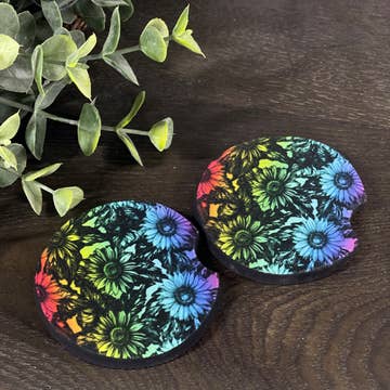 Our car coasters come in sets of two and are printed to order in house using high quality materials and processes. The print is permanent and will not fade, crack or peel. There may be slight differences in each print since they are hand made. The car coasters are made of neoprene material. They have a soft polyester front with a black rubber backing. They measure 2.56” in diameter and are .22” thick. Print is on front side only.