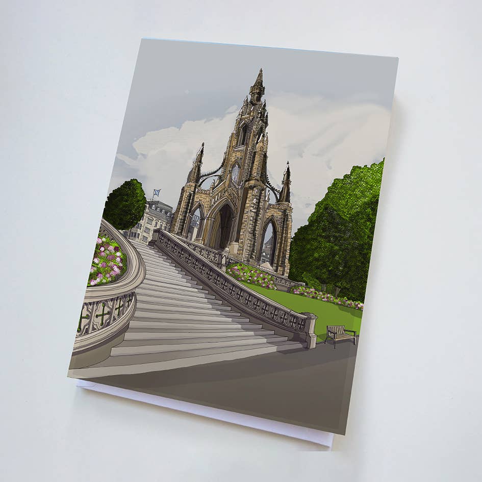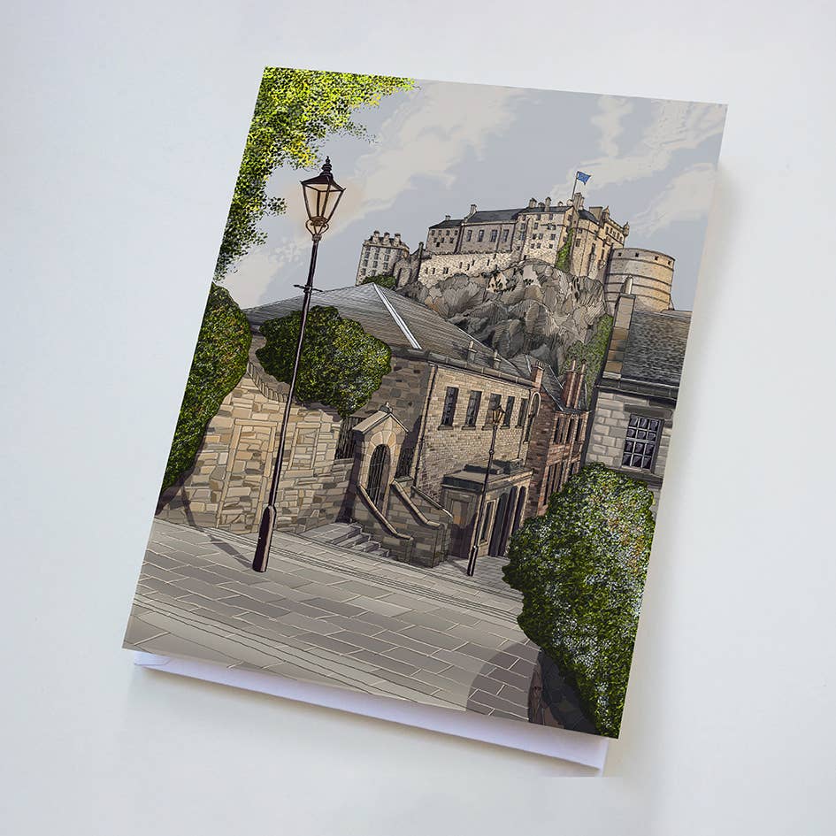 Edinburgh Castle & The Vennel Steps Illustration Edinburgh 10.2x10.2cm, 3mm thick MDF coaster has rounded router cut edges and a glossy surface Raw back Pack Size - 6 Wholesale Unit Price £2.40, RRP £6.00 © Turadh Design Co.