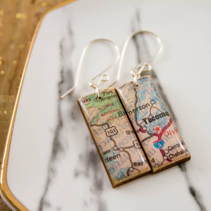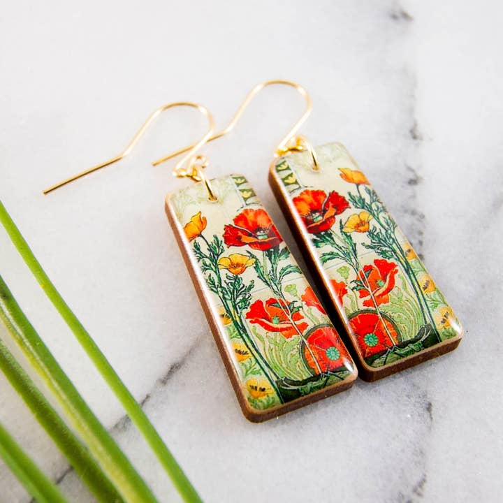 Vibrant, vintage US-issued Montana stamp, issued in 1989, commemorating the state's 100th anniversary. Made from sustainably sourced North American maple wood, and finished with soy-based, BPA/VOC free resin. Approximately 2 inches long and .5 inch wide. Handcrafted, sterling silver ear wires.