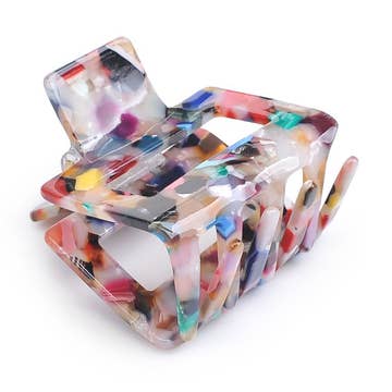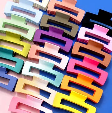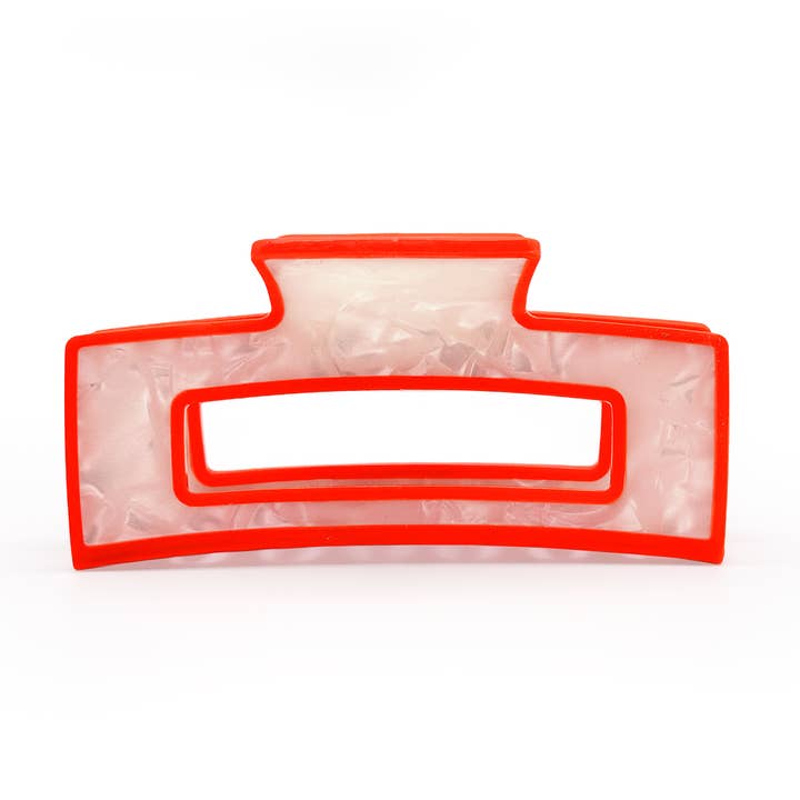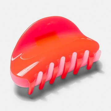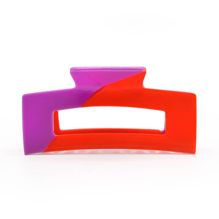 Fun rectangular cut out hair claw with diagonal color blocking in a juicy orange and perfect pink combo. Looks great on all hair shades.