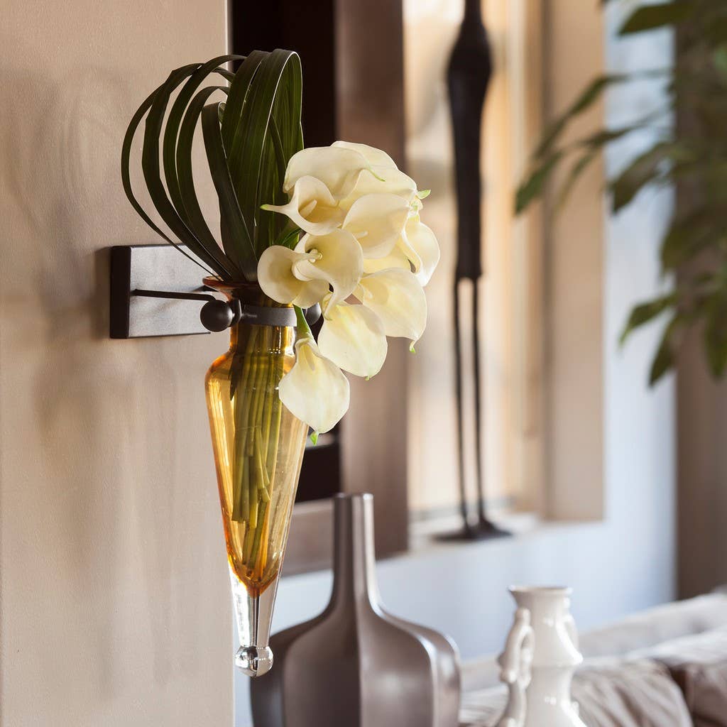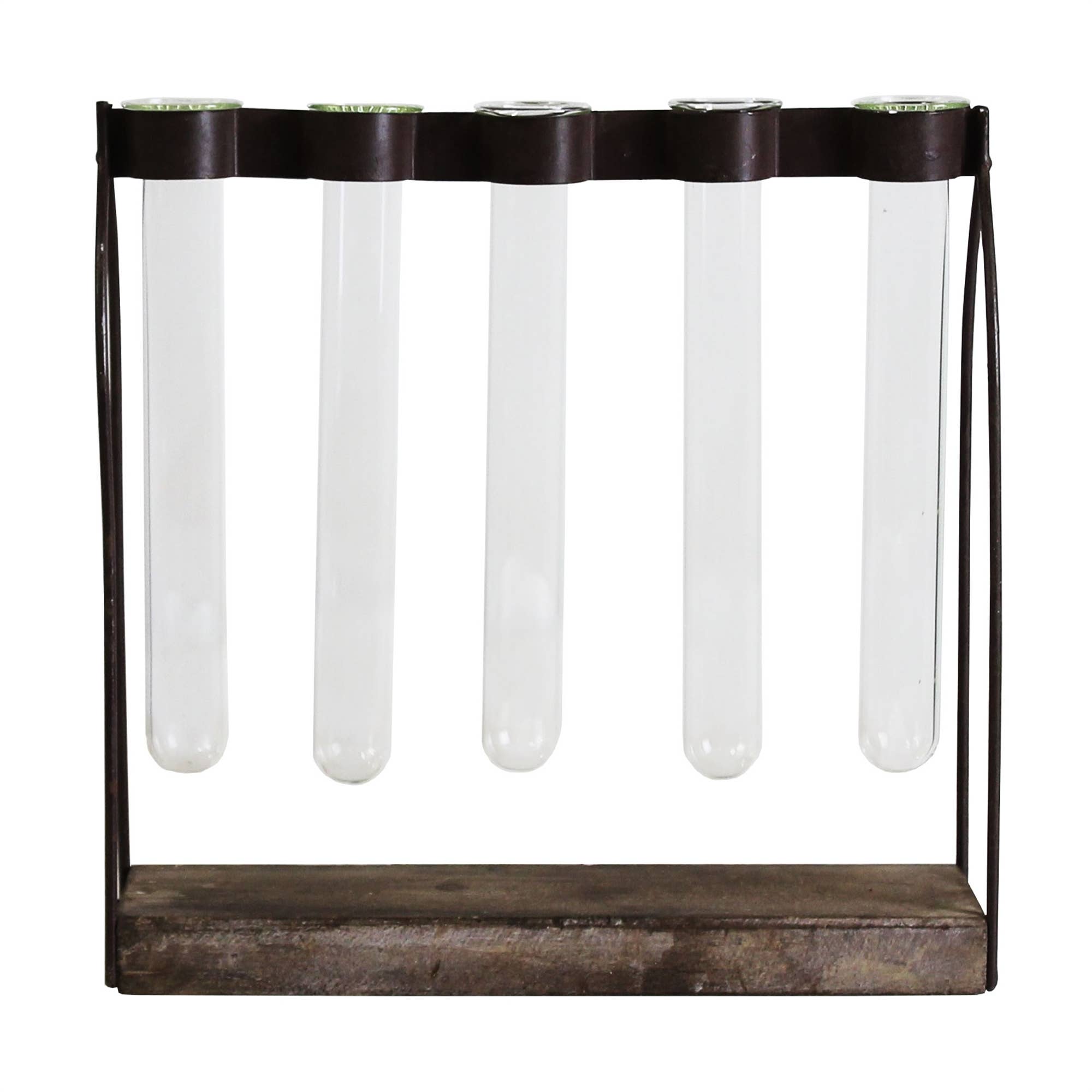 Danya B. set of 2 cylinder recycled glass tubes in rustic rings metal stand hang as a swing from a stylized matching hook. Glass slides out for cleaning. Hold a bud or a small bouquet, make a statement this pair of beautifully crafted wall vases frame a door or a piece of furniture. Works indoor or outdoor as a patio accent. Showcase your style and ingenuity with this stunning wall-mounted vase set! Instantly transform any space with these decorative pieces that provide design flexibility - hang them as swings, adorn a door or piece of furniture, or move them outdoors for a charming patio accent. Easy to clean and a delight to behold, these cylinder vases will make a statement for years to come.