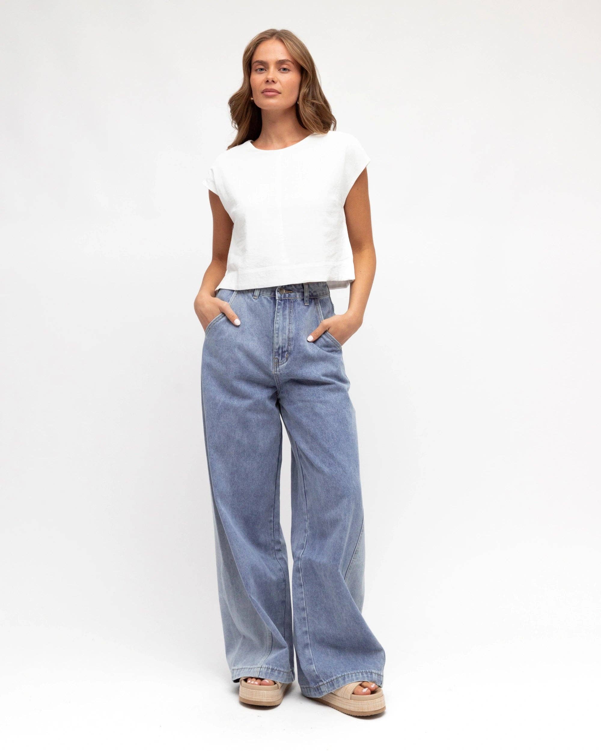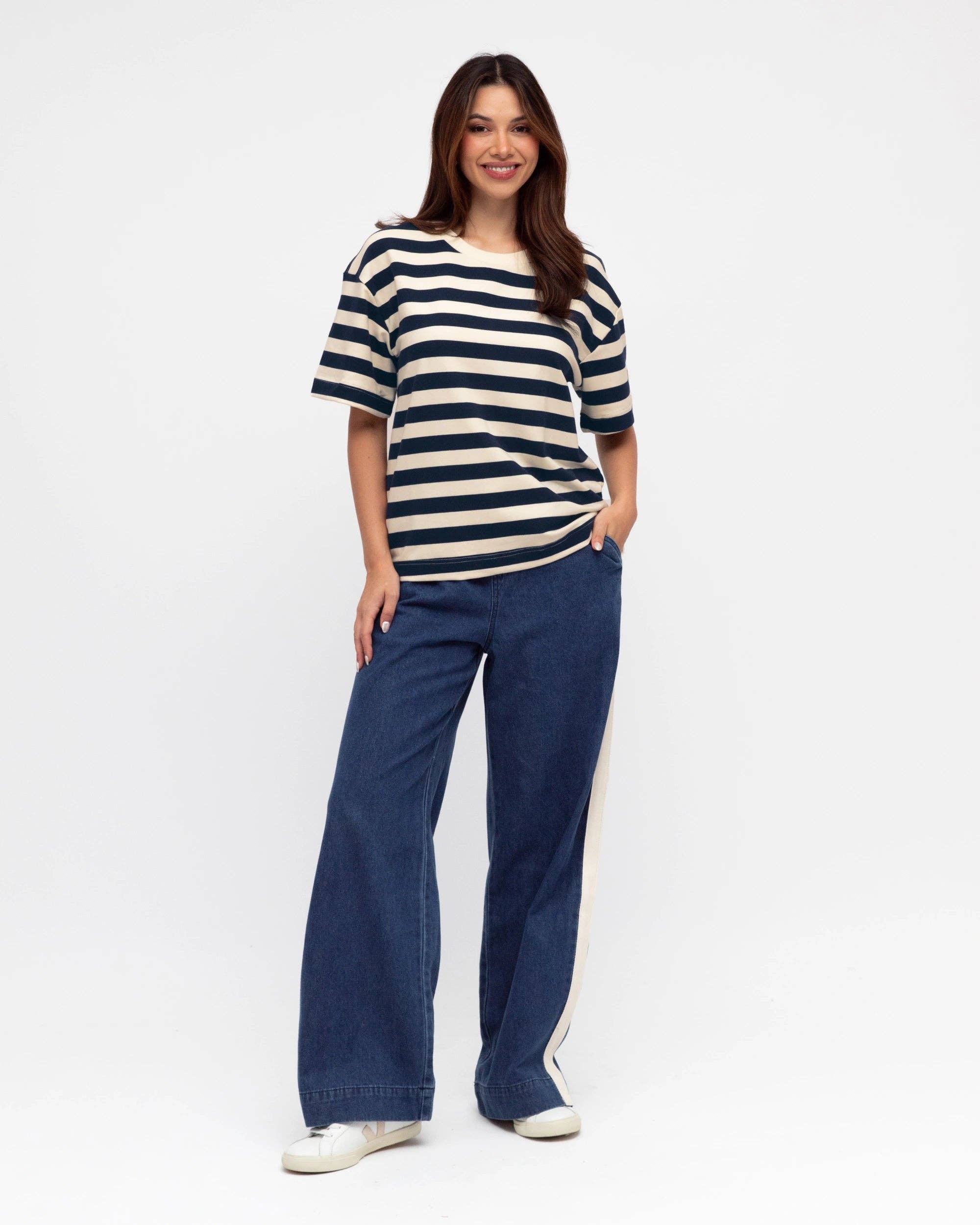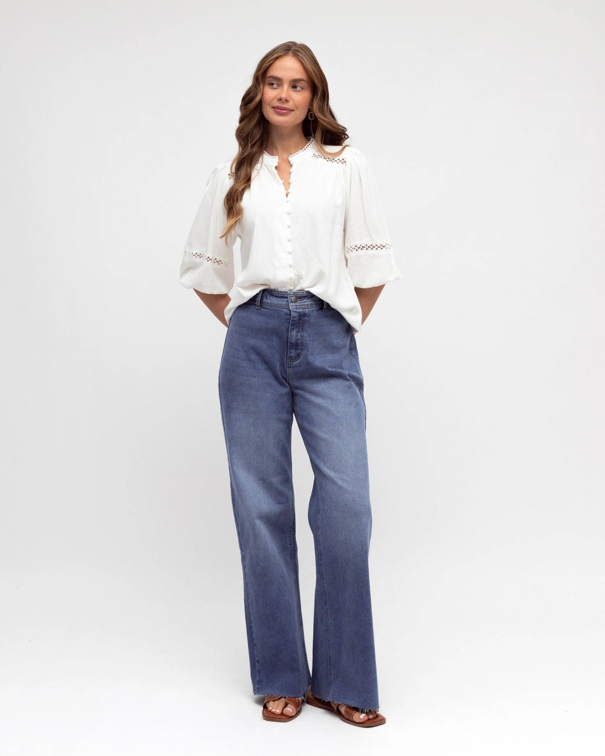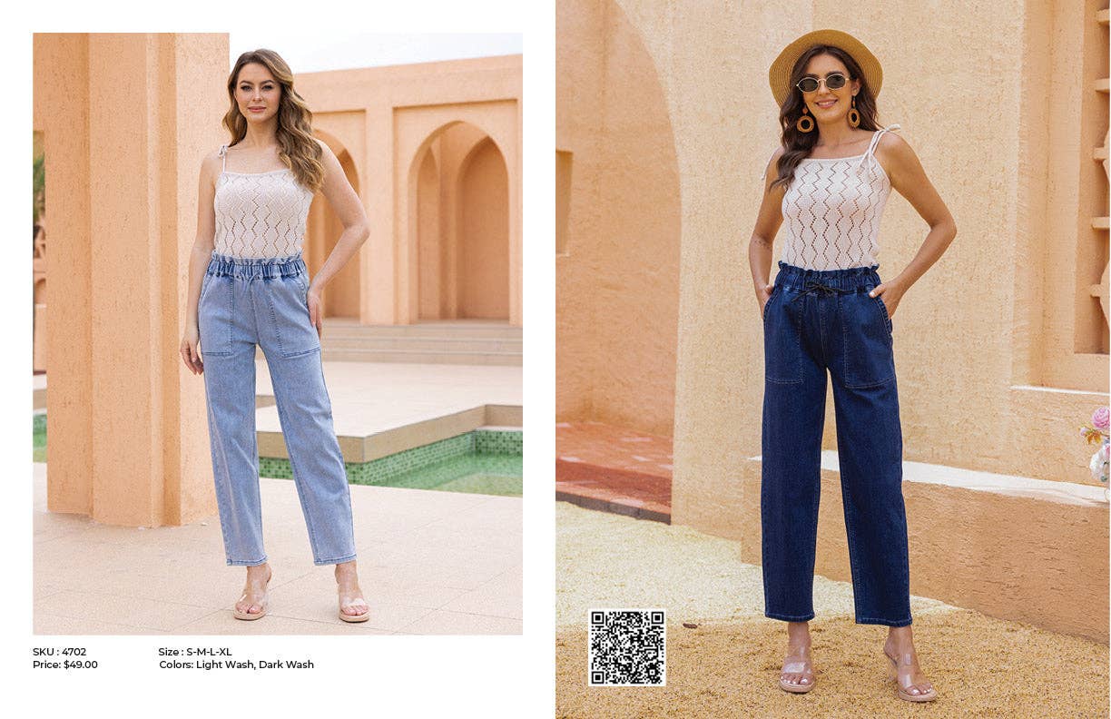 ∙ PH14044 ∙ 100% Cotton ∙ 6:8:10:12:14=1:2:2:2:1 ∙ High-waisted ∙ Side and back pockets ∙ Fly front with button closure ∙ Contrasting studs design ∙ Back yoke detail ∙ Straight-leg ∙ Relaxed fit ∙ Our model is wearing size 8
