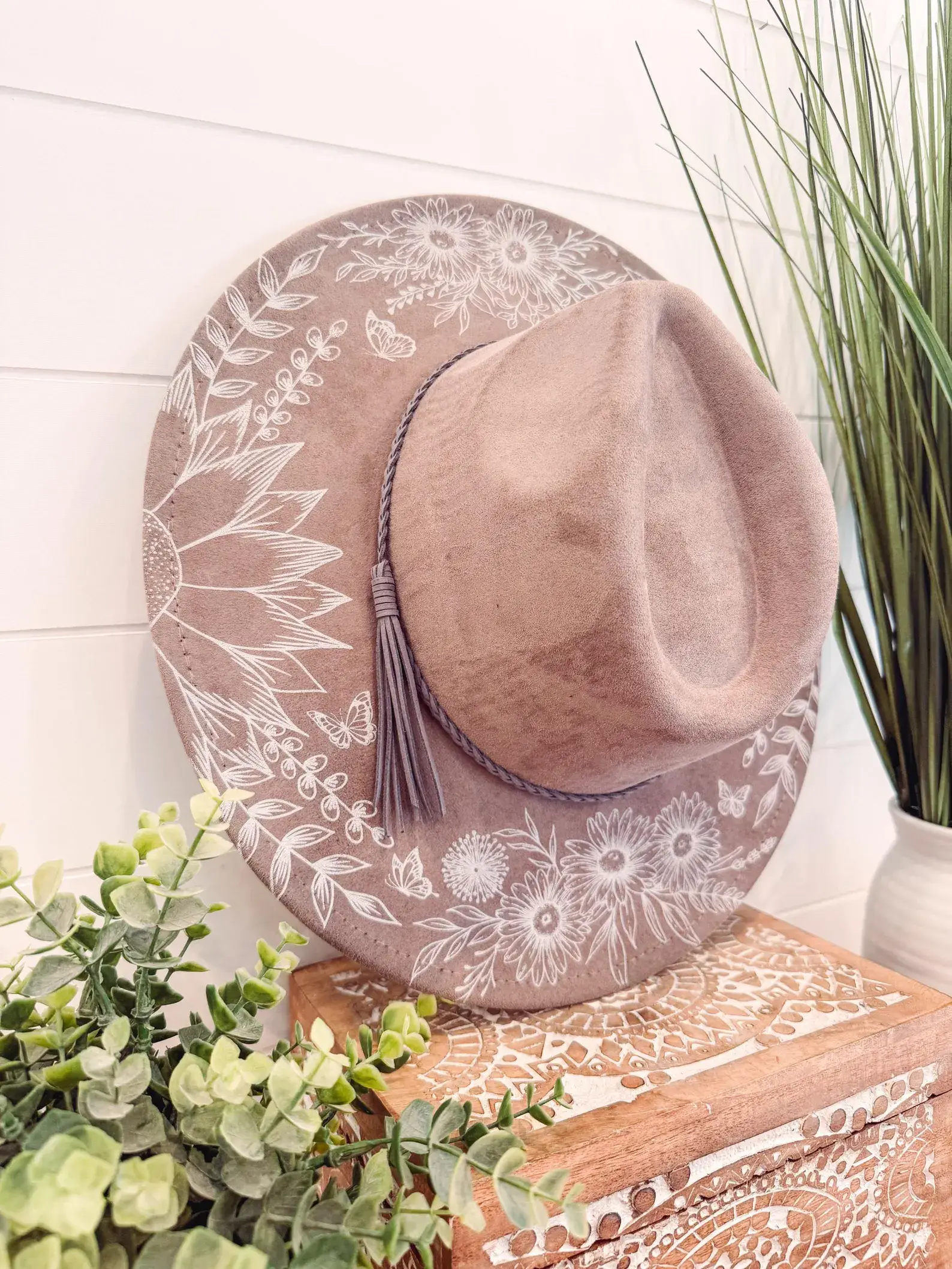 Introducing The Overcomer. This hat exudes the calming, well balanced energy of koi known for persevering and courage. Each hat is hand drawn/painted and burned by our artist upon order - no stencils are ever used. Each hat is unique though almost identical. This “Vegan Suede” Rancher hat features a camel colored material with wide brim, perfect to top off any outfit. Depending on number of items ordered in your purchase, hand painted items may not leave our store for up to 21+ days (we will message you approximate times if you place a larger order). *Please note, each hat has adjustable ribbon inside to fit various head sizes. **Looking for a different color hat, or specific colors within this design? Please search for our custom hat orders under our products tab. ***To clean, lightly brush with soft rag. If brim gets bent, you can lightly steam nonpainted side and then lay flat with books weighing down brim.