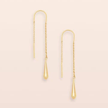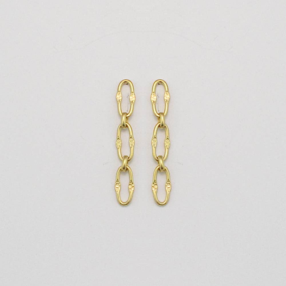Detailed chain earrings for making a glittery statement. Available packaged on a card or in a jewelry bag. Display box provided with the purchase of 10 or more earring cards. Details: 14k gold filled. 1.5" drop. Hypoallergenic.
