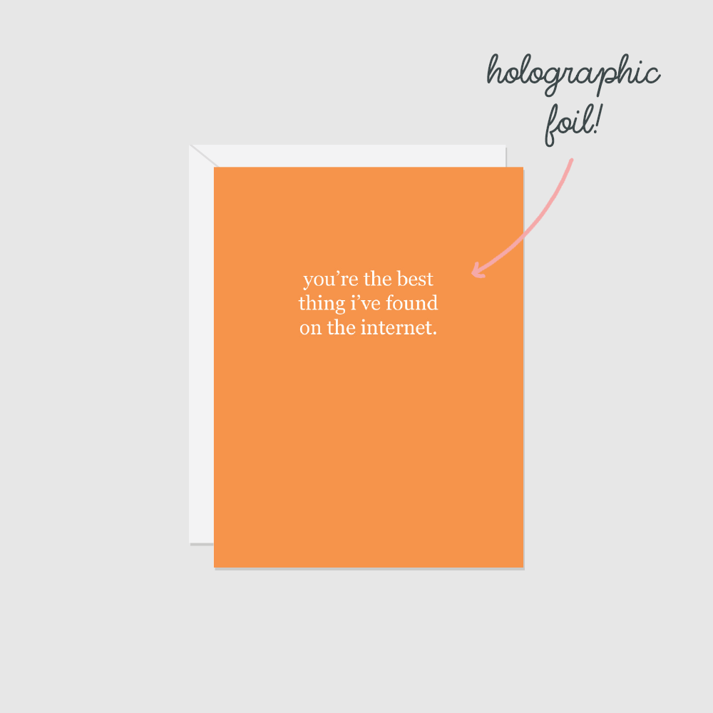 Create a stunning visual effect on your card wall (or rack) with our beautiful new collection of foiled note cards, for all occasions. Product Description: • Blank inside • A2 sized (4.25" x 5.5") vertical folded greeting card • Comes with a coloured, deep-v, euro-flap, custom embossed envelope • Holographic foiled lettering • Extra thick, luxe card stock with a silky smooth finish • Created with non-toxic, vegetable-based inks on paper that is SFI, FSC & Rainforest Alliance Certified