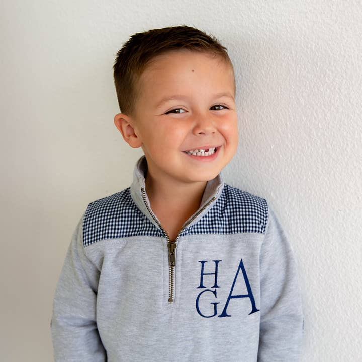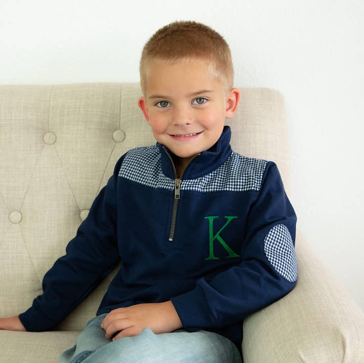 Our Miller Collection Pullover is a classic that you are sure to love! Made with high- quality, versatile knit cotton on the outside and a comfy fleece on the inside. This 1/4 zip pullover features a Seersucker / gingham Shoulder and Elbow detail trim! It's the perfect preppy and classic addition to any wardrobe for year-round use....keep them snuggled up on a cool fall day or carry on a nice hike, wear on the golf course, the backwoods bonfire or early morning soccer game! Details....