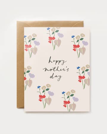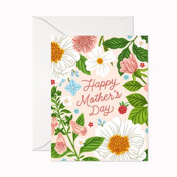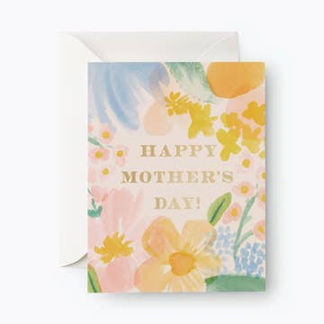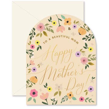 A wreath of sweet florals to celebrate all the Moms in your life. - A2 size (4 ¼” x 5 ½" when folded). - Blank interior - Paired with a gold leaf envelope - Printed full color on high quality cover paper.