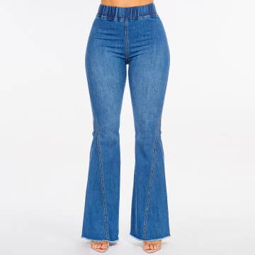 Ultra soft light weight flare baggy jeans. Soft tencel pre washed denim fabric. Wide elastic waist band. Flare bottom. Front and back with 5 pockets detail. Mid rise. Jeans but feel like a athleisure. 37% cotton 51% poly 12% spandex. Import. Inside pack comes S/M/L (2:2:2) 6pcs/pack.