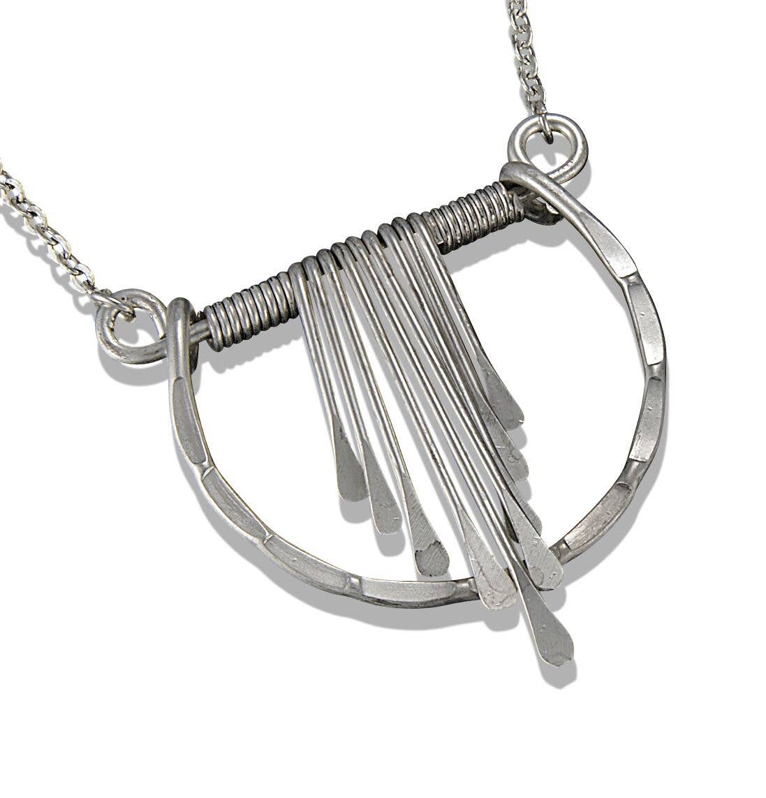Sterling silver. Pendants 3 1/2" and 28" closed silver chain. Textured minimal pendant in silver. Each mark and groove hammered by hand and finished with a time-worn patina. Hangs from an antiqued silver chain.