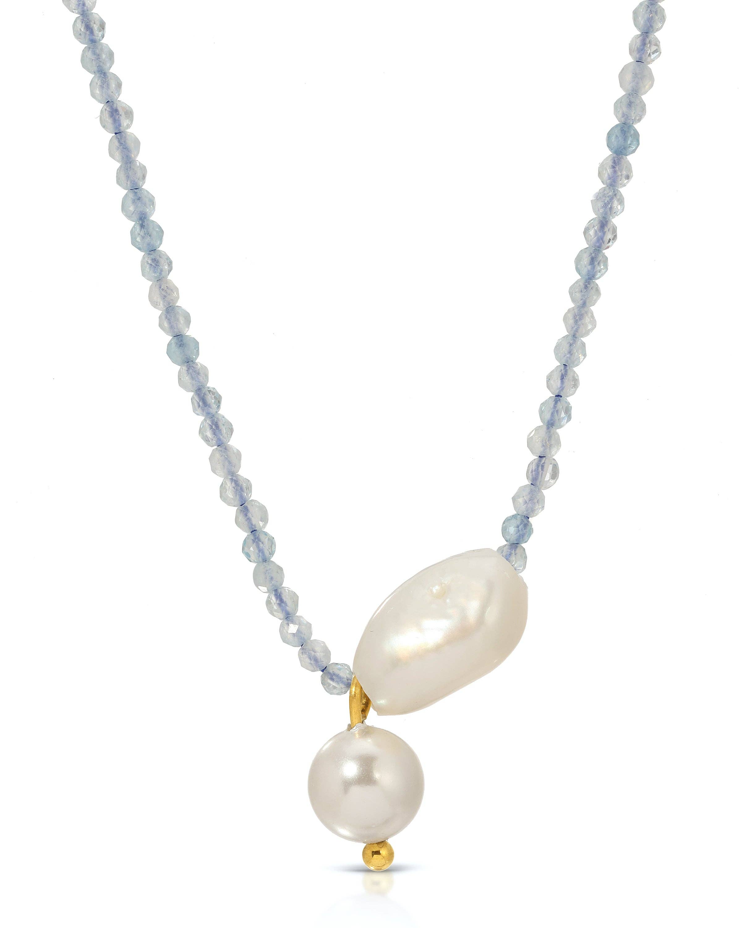 This long vermeil necklace is made of Sleeping Beauty Turquoise, faceted labradorite coins, and features an exquisite chalcedony teardrop pendant. 28". Gold-plated toggle. Handmade in the USA.